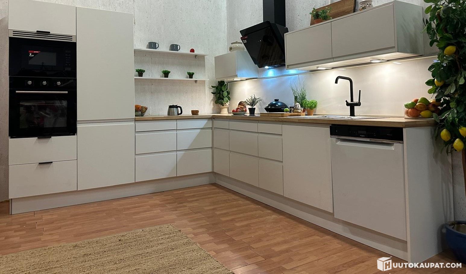 Parma kitchen Magnora with new appliances, sink and tap included (model group). Straight lines and a luxurious urban look are at the heart of the Magnora kitchen. The white Magnora door gives a minimalist and elegant appearance. Parma Magnora doors are handleless, so handle styles never date! Black appliances add stylish contrast and edge to the white kitchen.