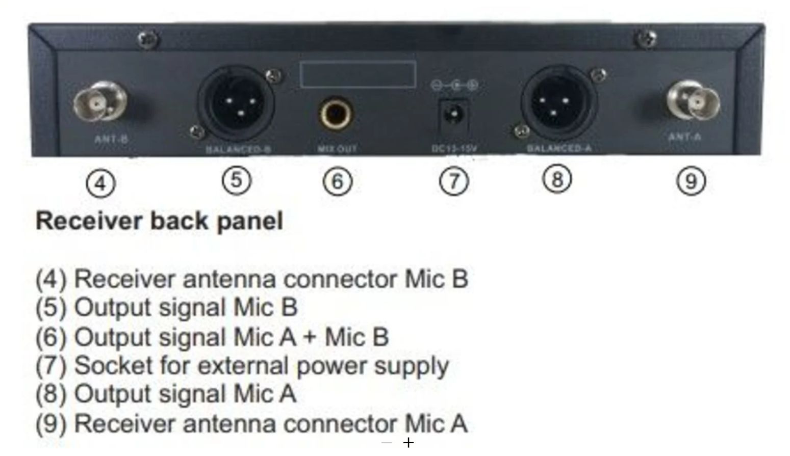 Selectable frequencies (2 channels) in the 635.00–684.750 MHz range; each microphone has 100 selectable channels