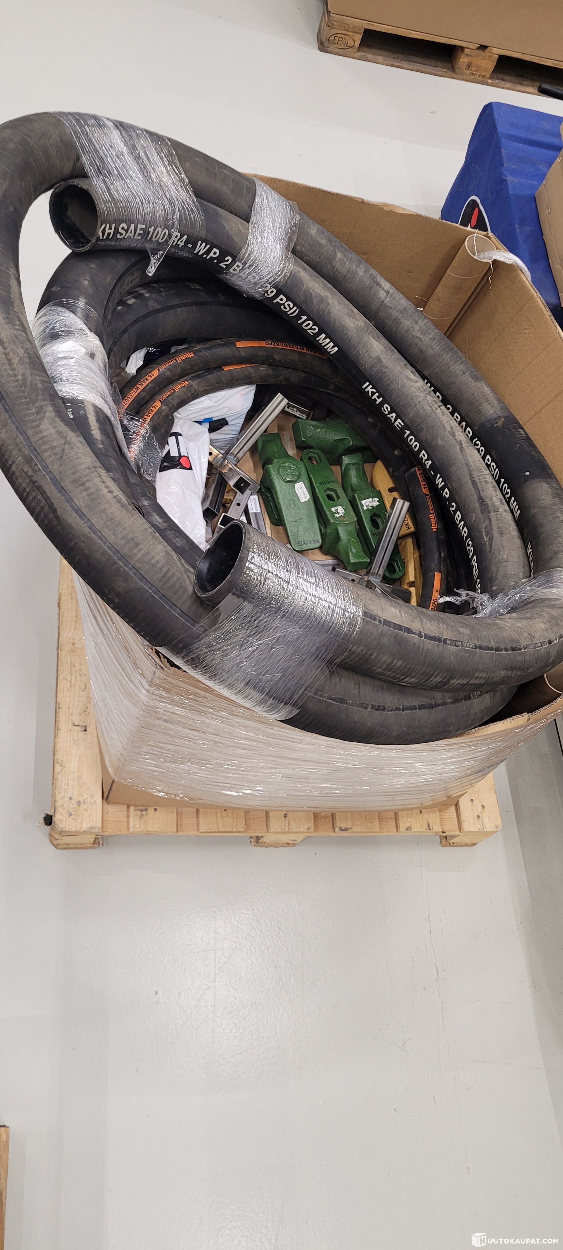 Items on the pallet range widely, e.g. hoses, bucket teeth and adapters, tractor spare parts, corner pieces …