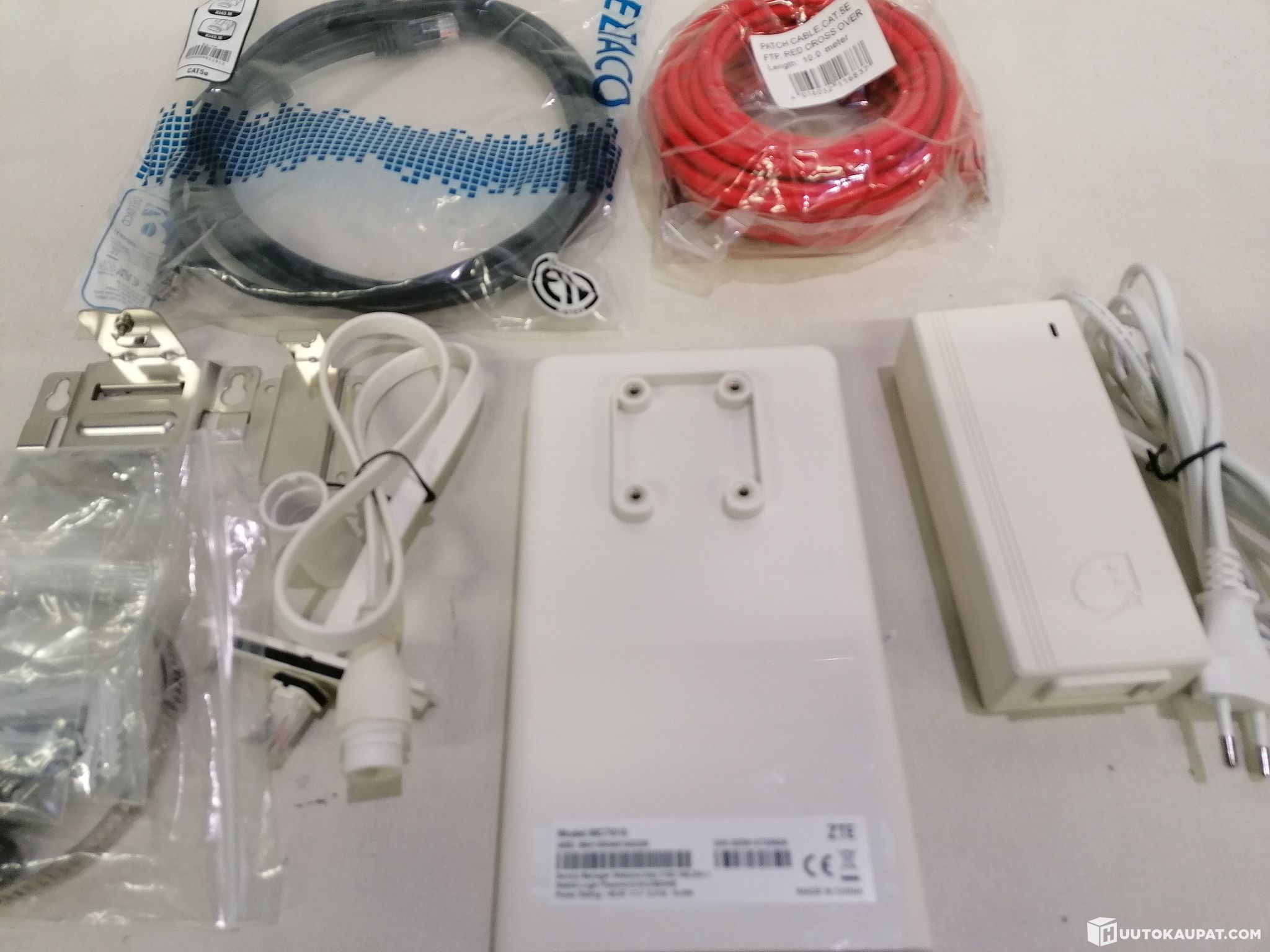 The router comes with a wall mount, a downlead cable to the base of the device, mounting screws, a metal clamp, a long Ethernet cable (10-metre), a second short Ethernet cable for indoors, a gasket for the feed-through between the downlead and the Ethernet, a PoE switch, and the power cable for it.