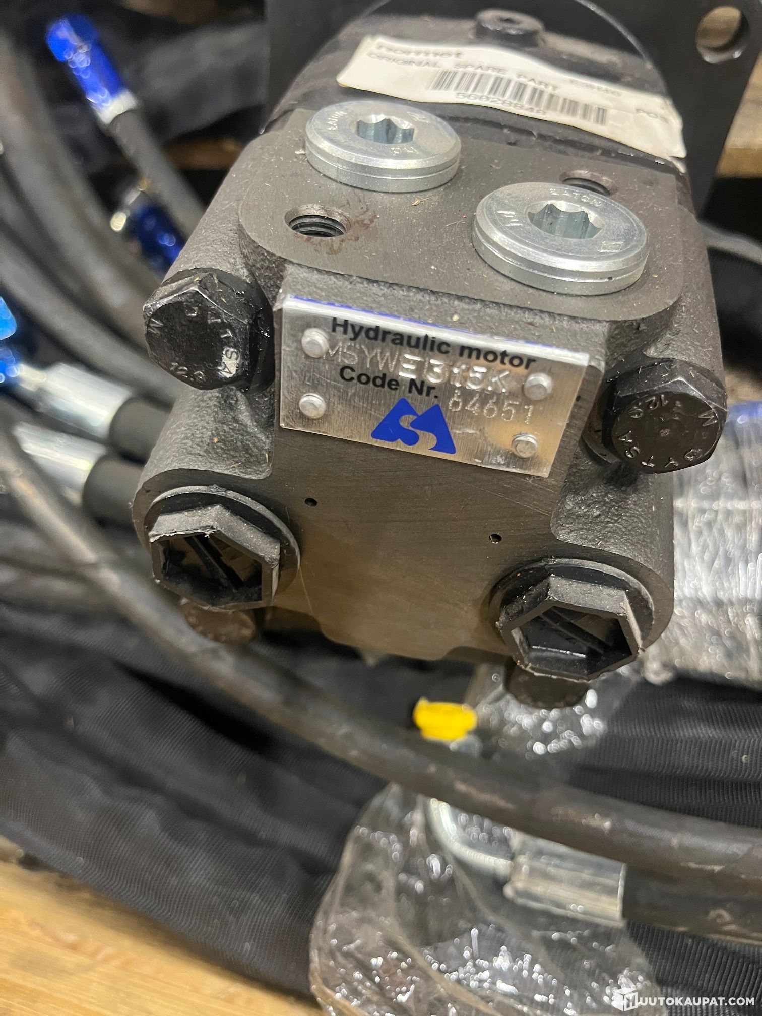Mixed parts on the pallets, e.g. new hose kits for forestry loaders, Robson towing unit motors and scrap metal.