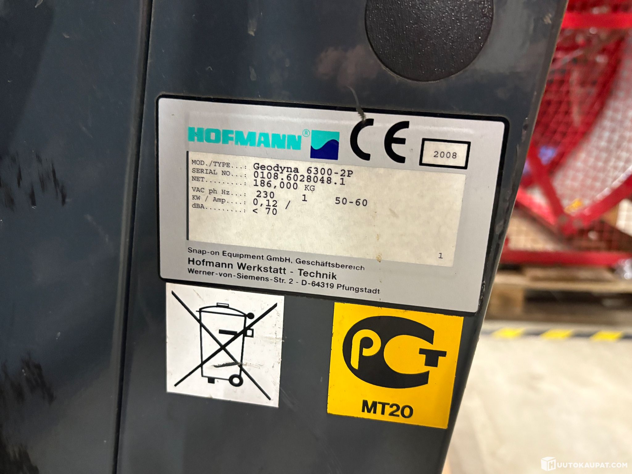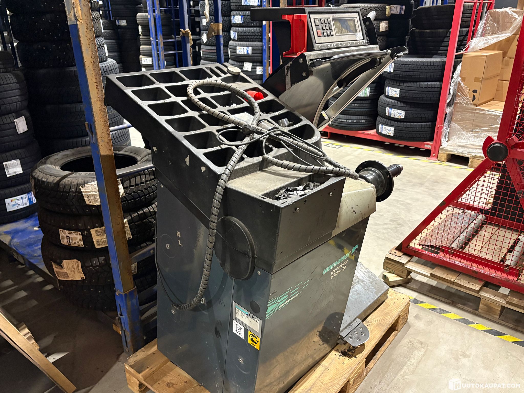 Car tyre balancing machine. Used in professional/service use. Display is broken, but otherwise functional. Requires display repair and calibration is recommended before use. Includes several centre‑hole adapters and a locking device.