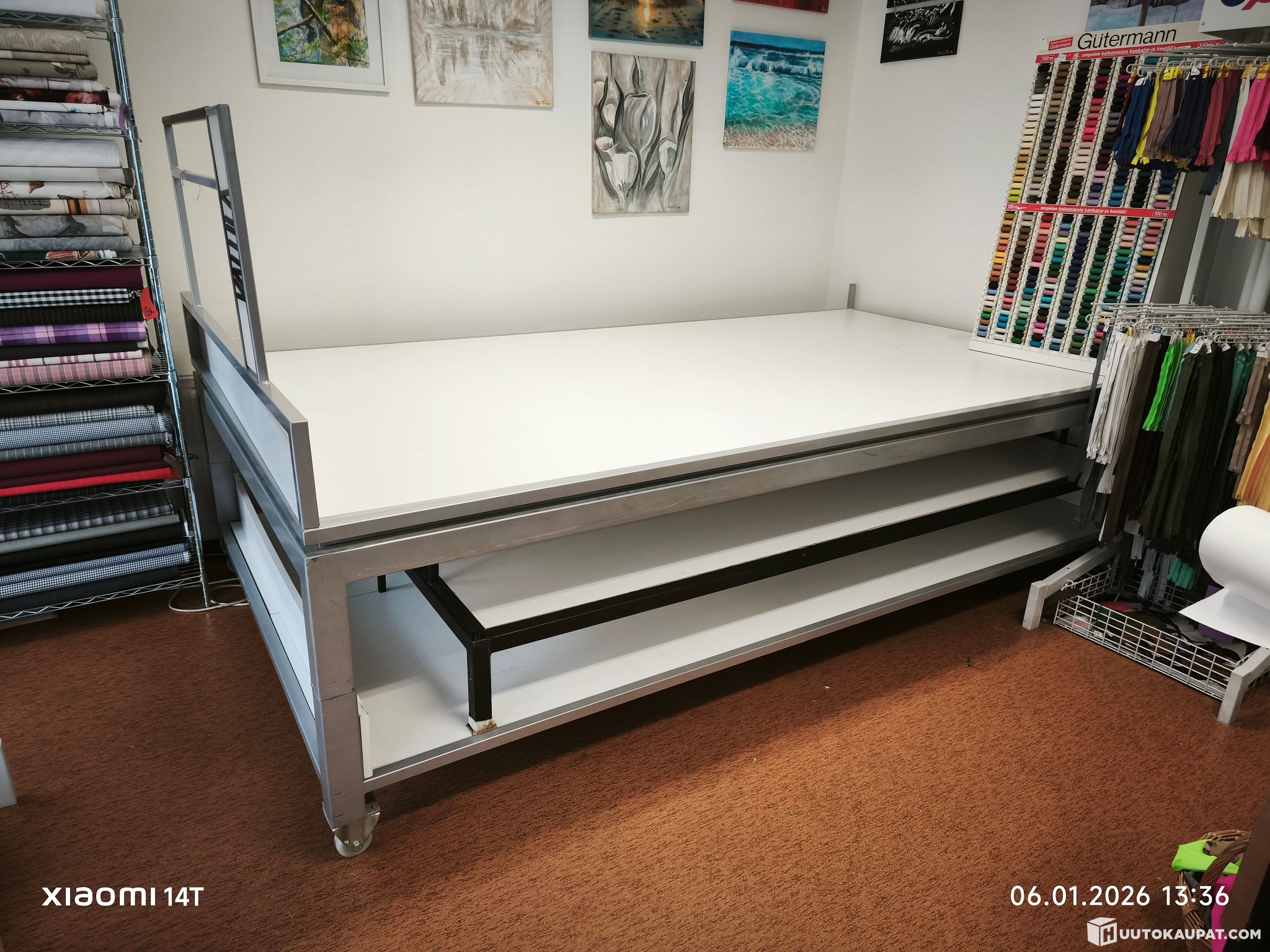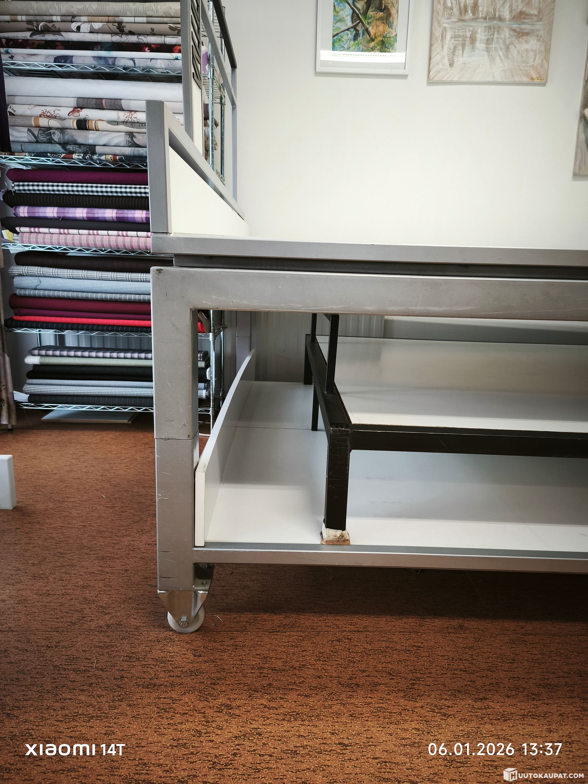 This table on wheels is easy to move around the room. Its dimensions are approximately 300 x 160 mm. It can be dismantled into two parts for easier transport. It is ideal for cutting fabric, etc. There are signs of use.