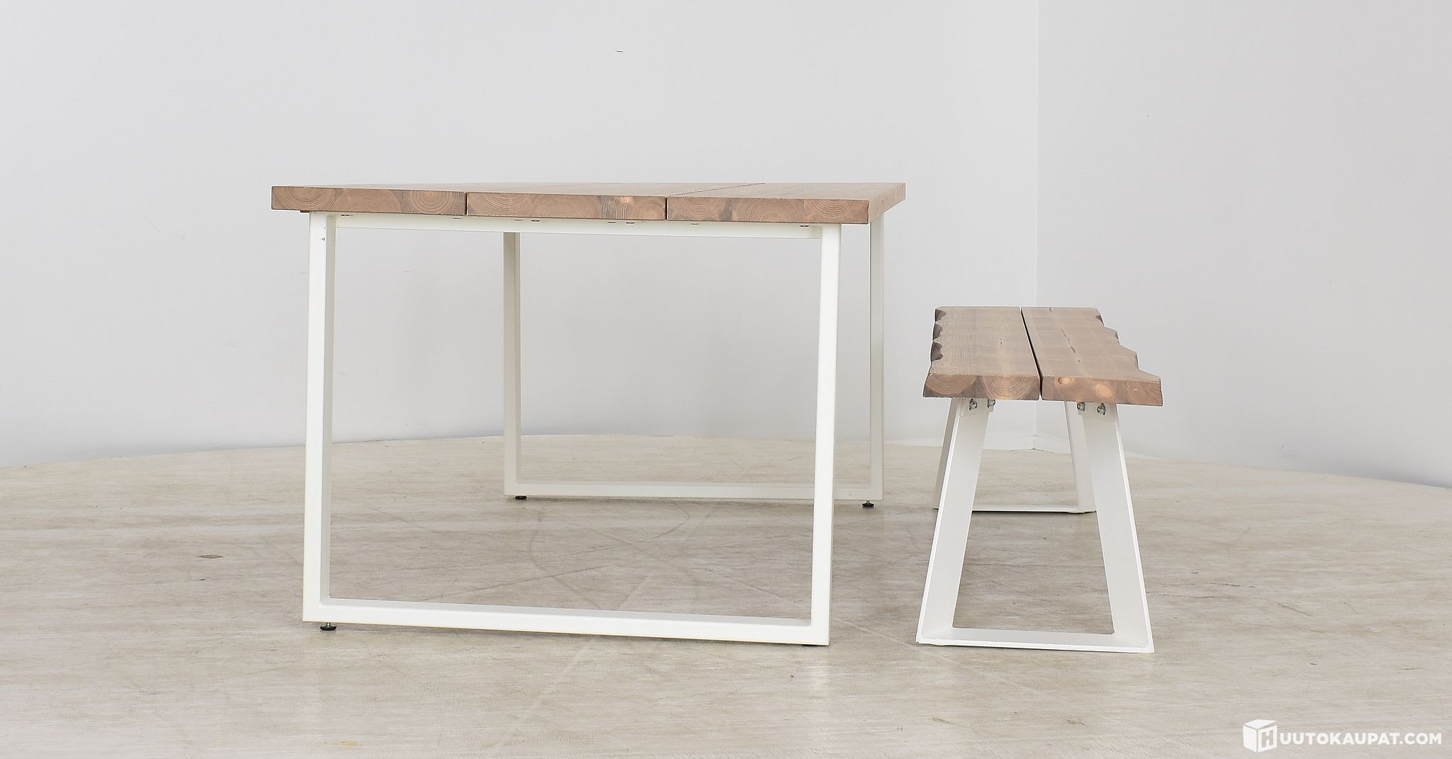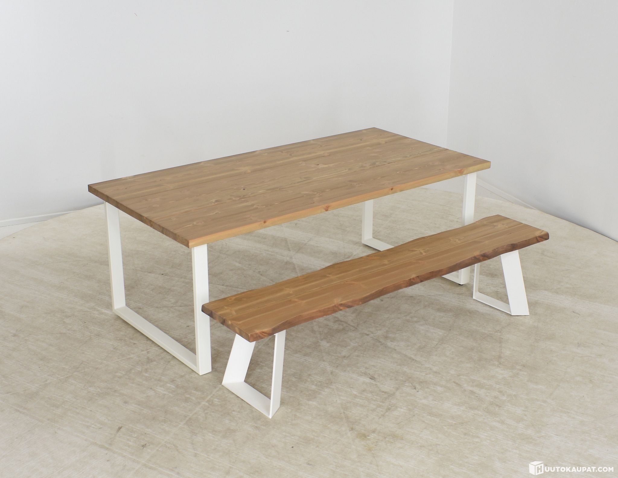 Näyttävä, rustiikkinen mutta ennen kaikkea kestävä Ruska lankkupöytä pysyy paikoillaan isommankin kuorman alla. Kolmesta tuhdista mäntylankusta koostuva kansi yhdistettynä kestävään teräsjalkaan tekee pöydästä ihastuttavan. Kansi on tehty kolmesta leveästä lankusta, joissa on harjattu ja petsattu pinta. Kannessa näkyy kauniisti puun syyt ja kuviointi, joten pinta ei ole tasainen. Pöytään on helppo yhdistää erilaiset tuolit ja kokonaisuus on valmis. Pöydän jalat ovat pulverimaalattua terästä, joten se kestää myös ulkokäyttöä.