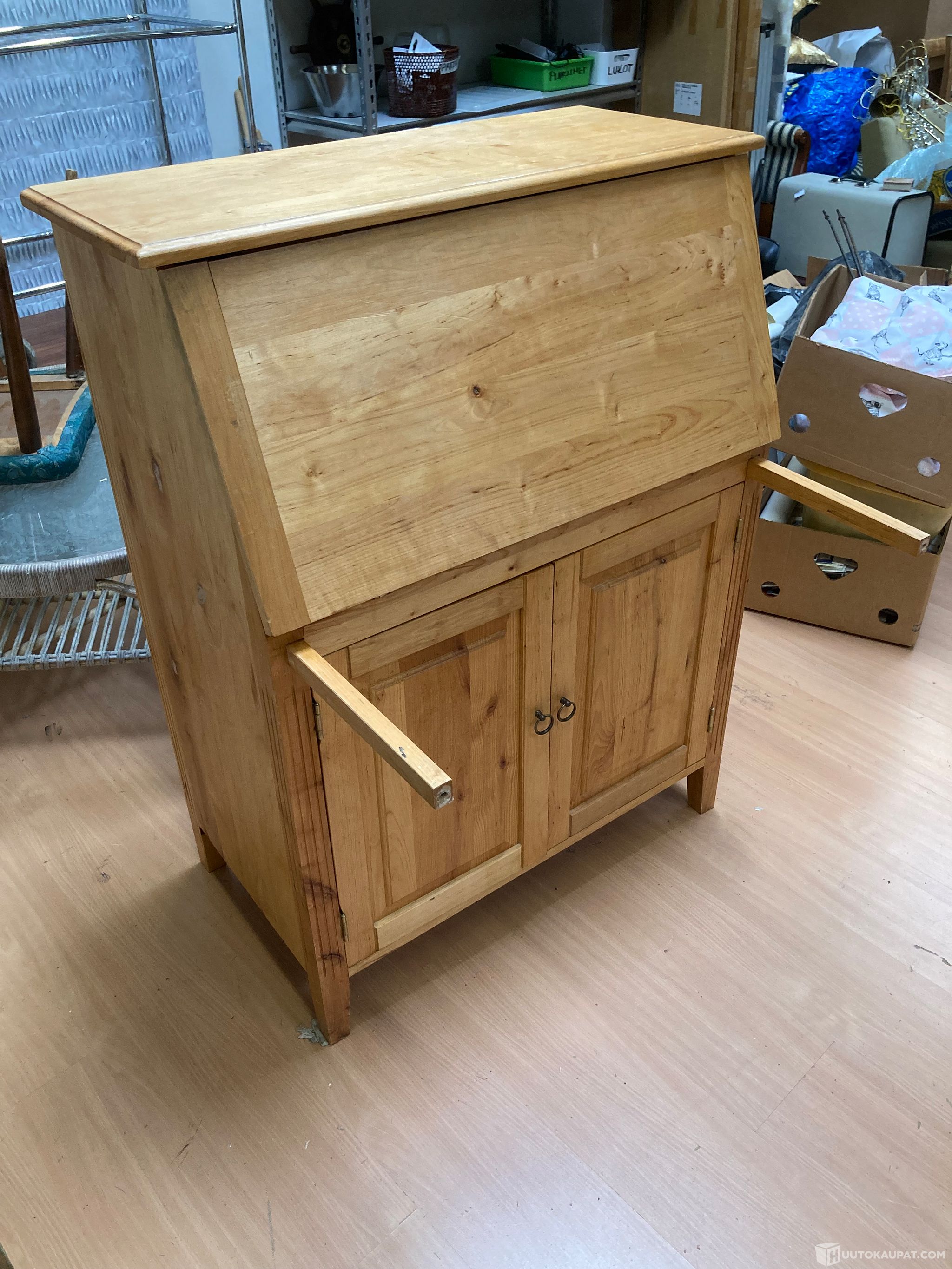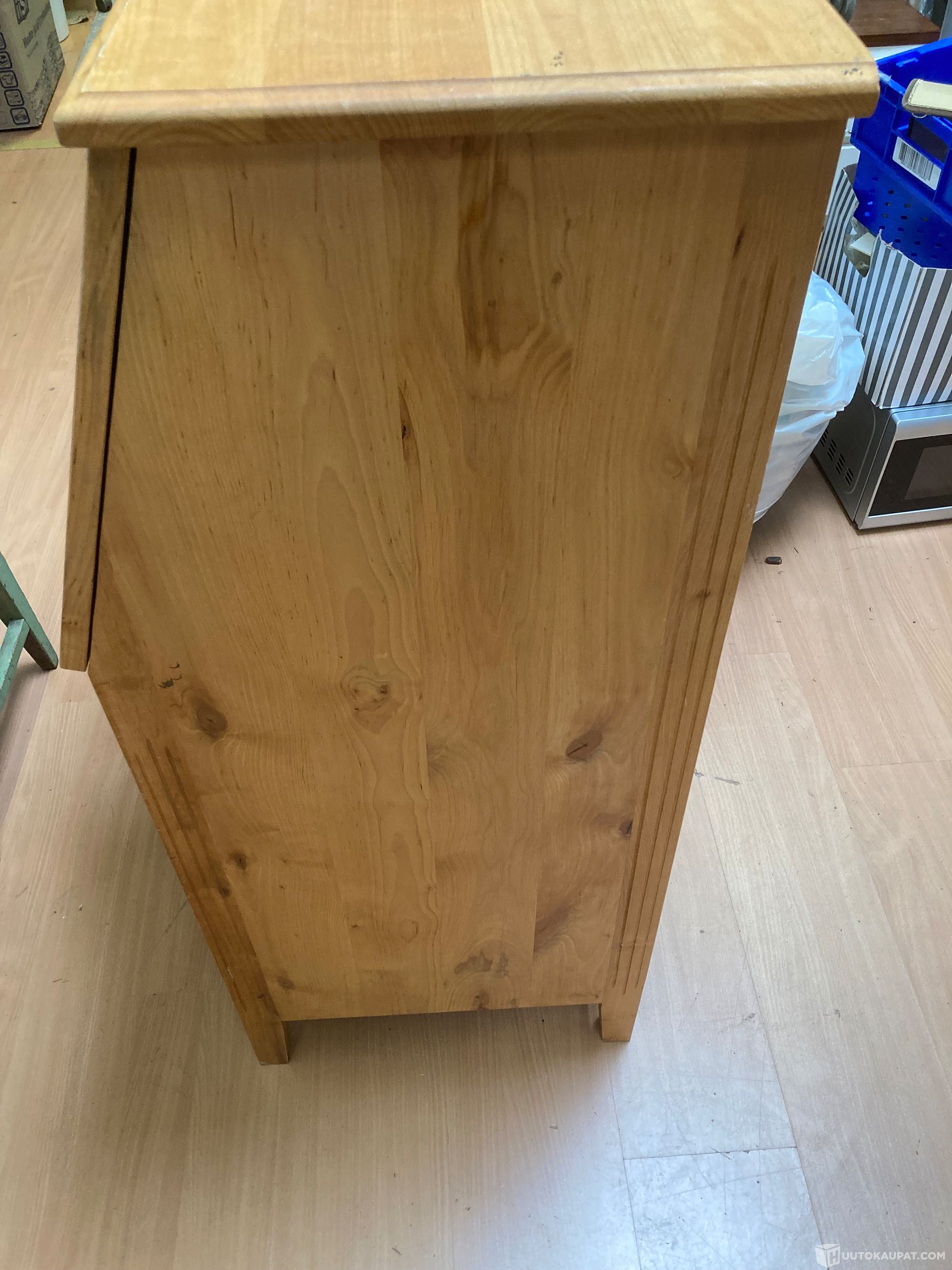 Siisti ja tyylikäs vinokirjoituslipasto. Tilaa säästävä kirjoituspöytäratkaisu. Alaosassa kaappi ovilla. Kokopuinen lipasto koristesorvauksilla. Ulosvedettävät tuet kirjoitustasolle. nätti patina. Kirjoitustaso kiinni mitat lipastolle: 85x47 cm, korkeus 111 cm.