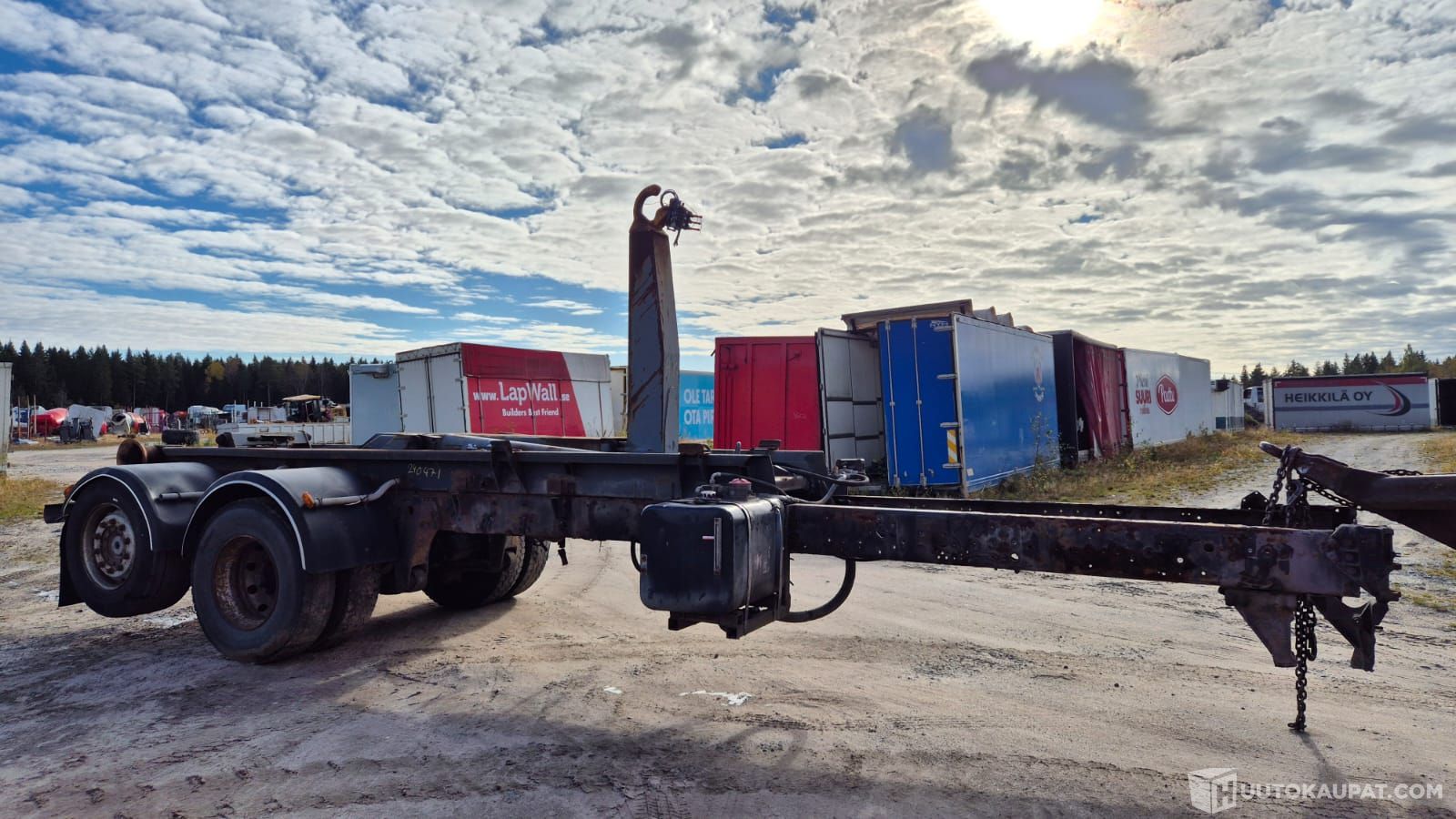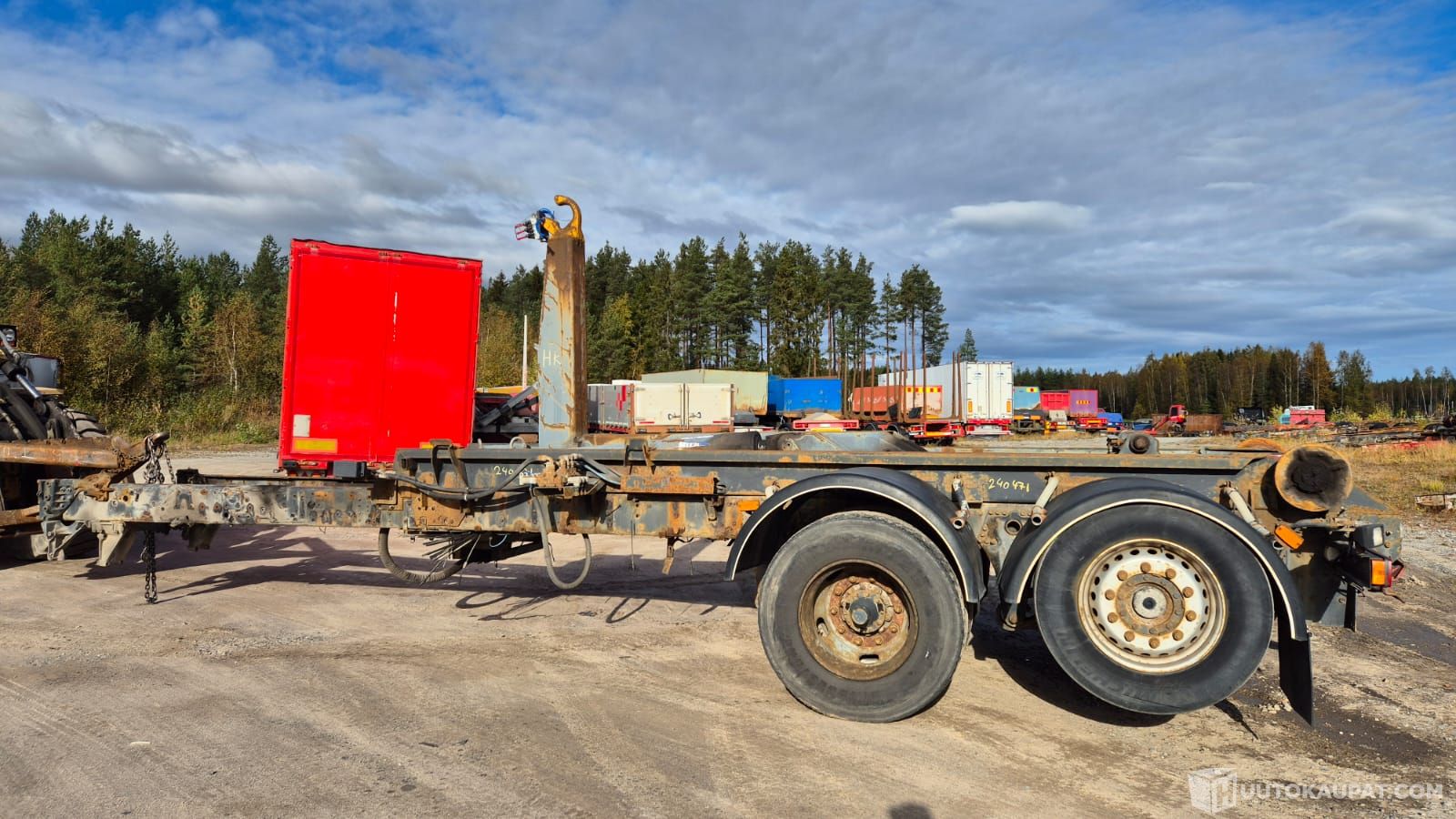 Scania takapää koukkulaitteella. Laitteen kokonaispituus noin 5.5m. Ilmajousi. Perä paikallaan mahdollisuus tehdä vetäväksi.