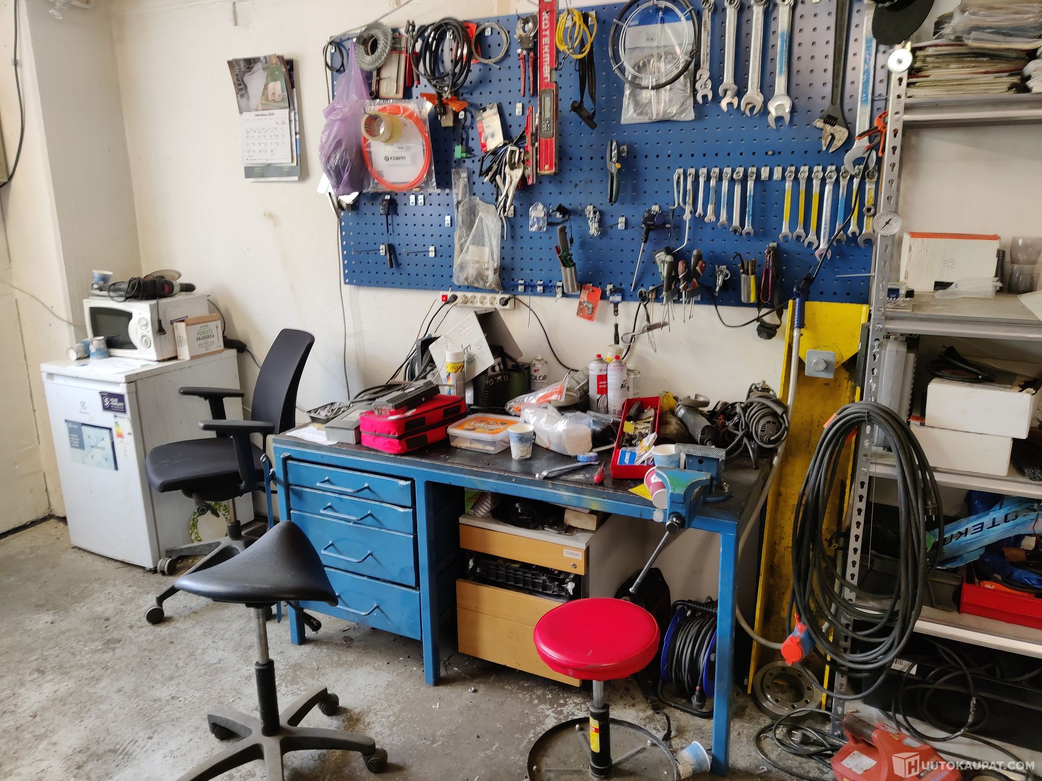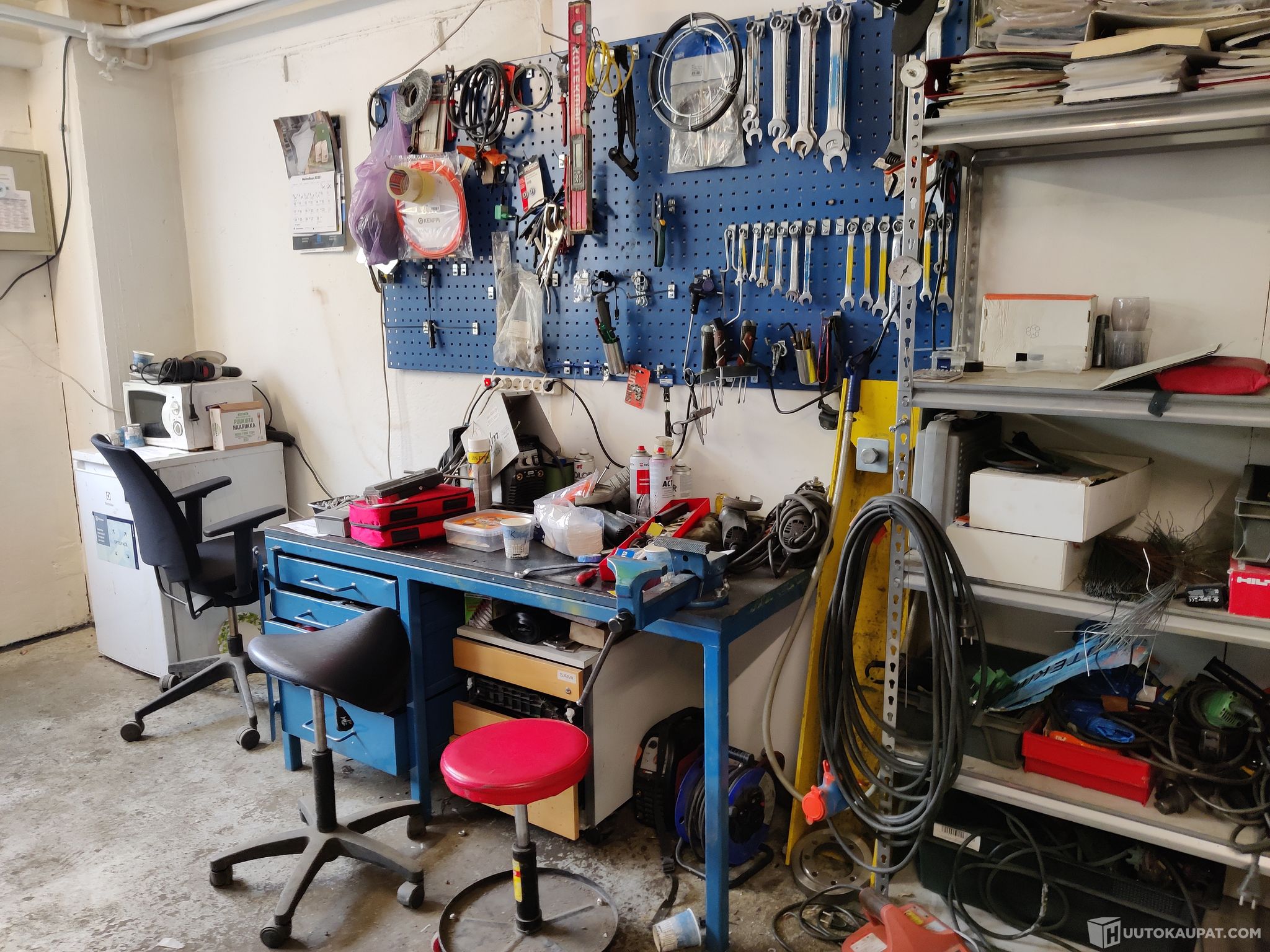 työpöytä, hyllyt, työkalut tarvikkeet