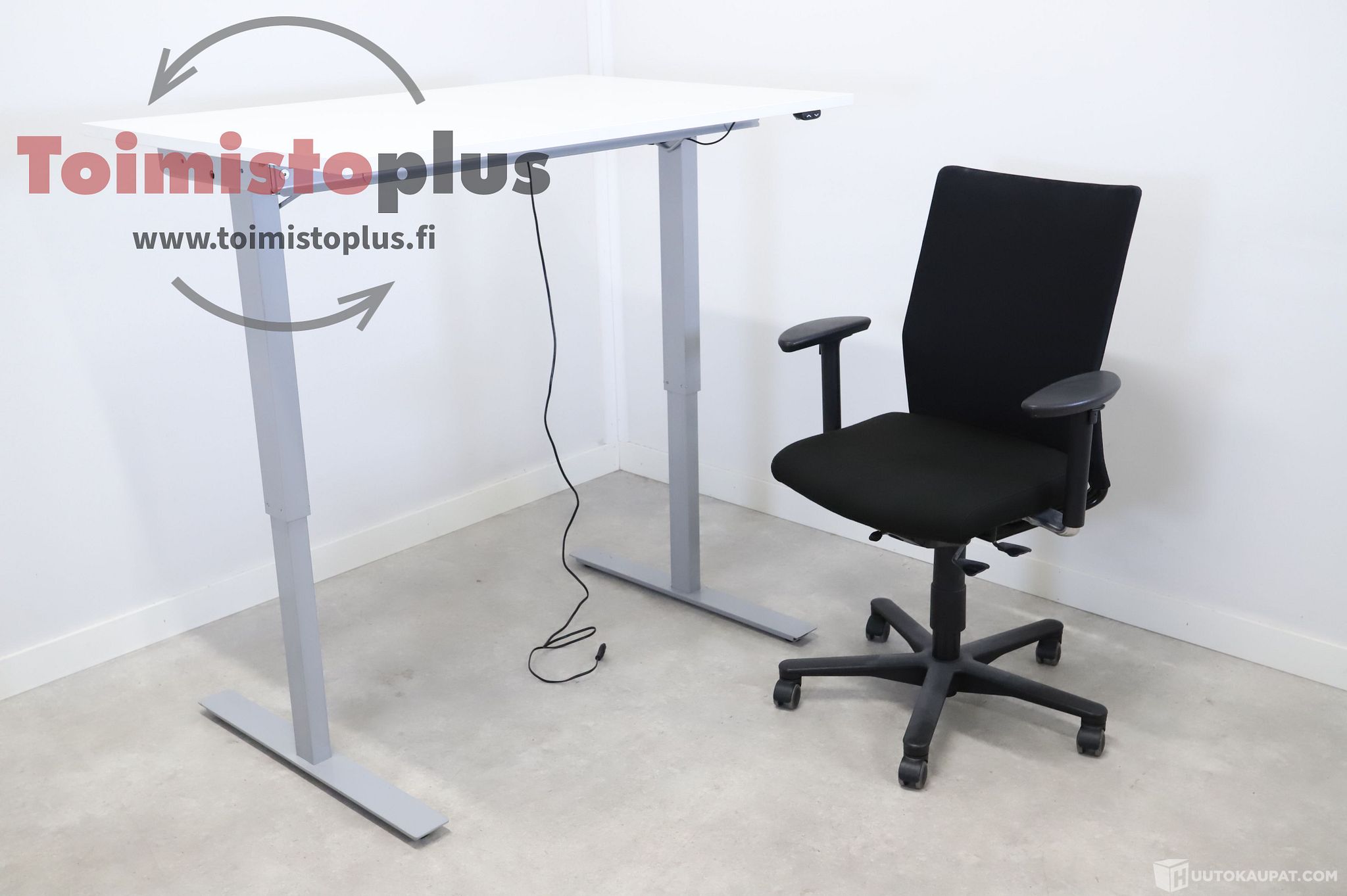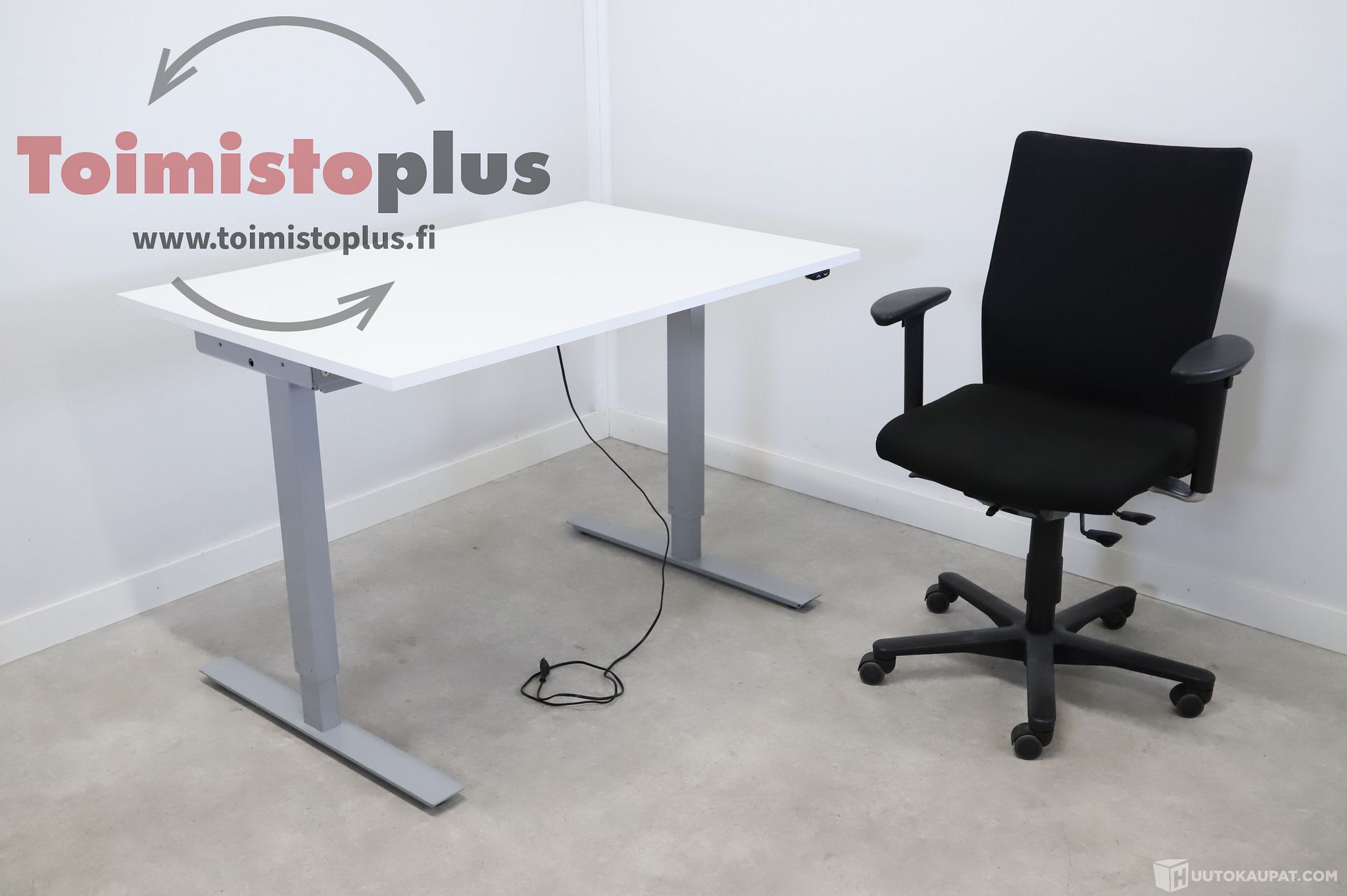 Sähköpöytä 1 kpl. Valkoinen kansi, harmaa jalusta. Korkeuden säätöväli 70cm-120cm. Kannen koko 120cm x 80cm.