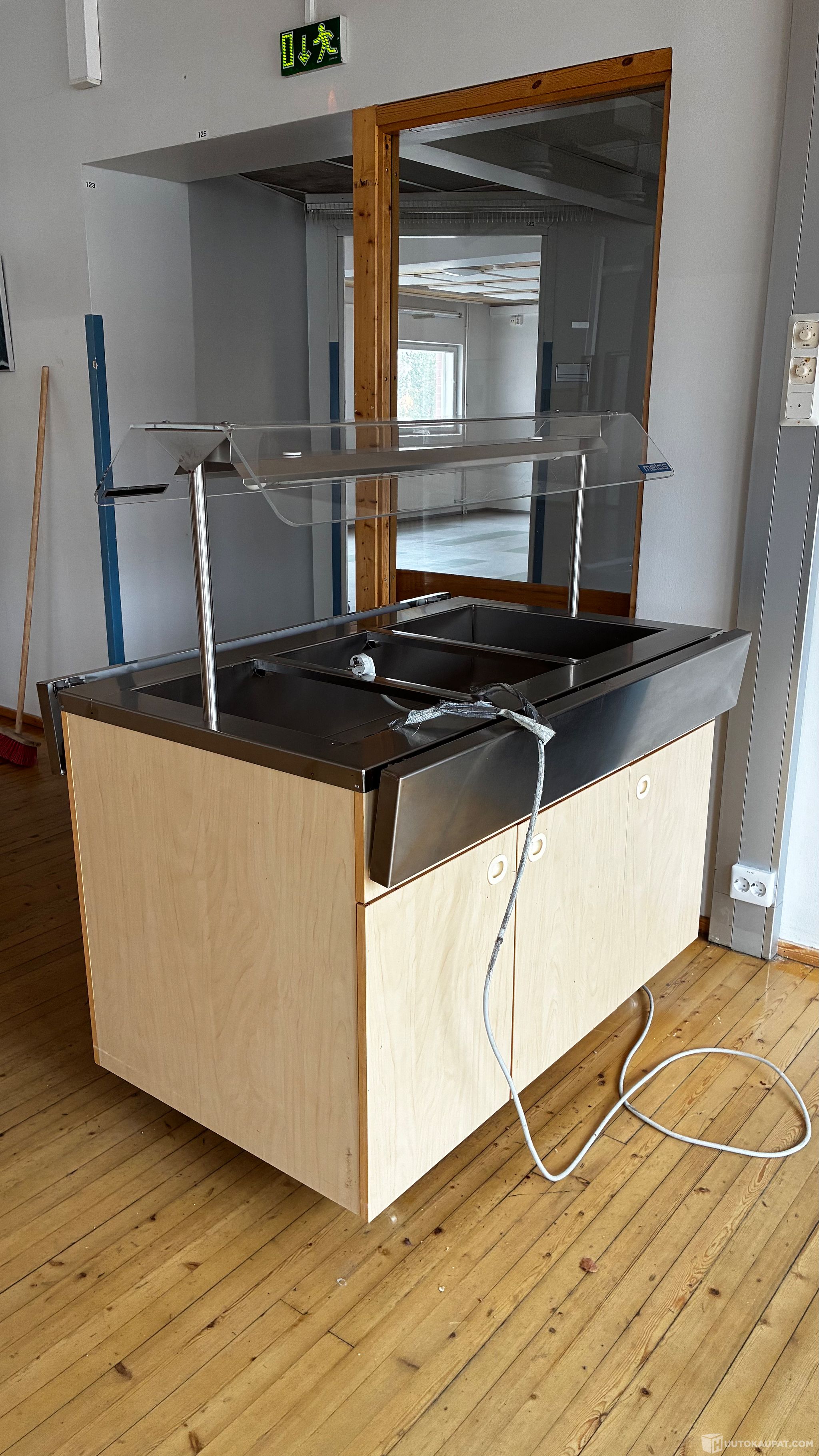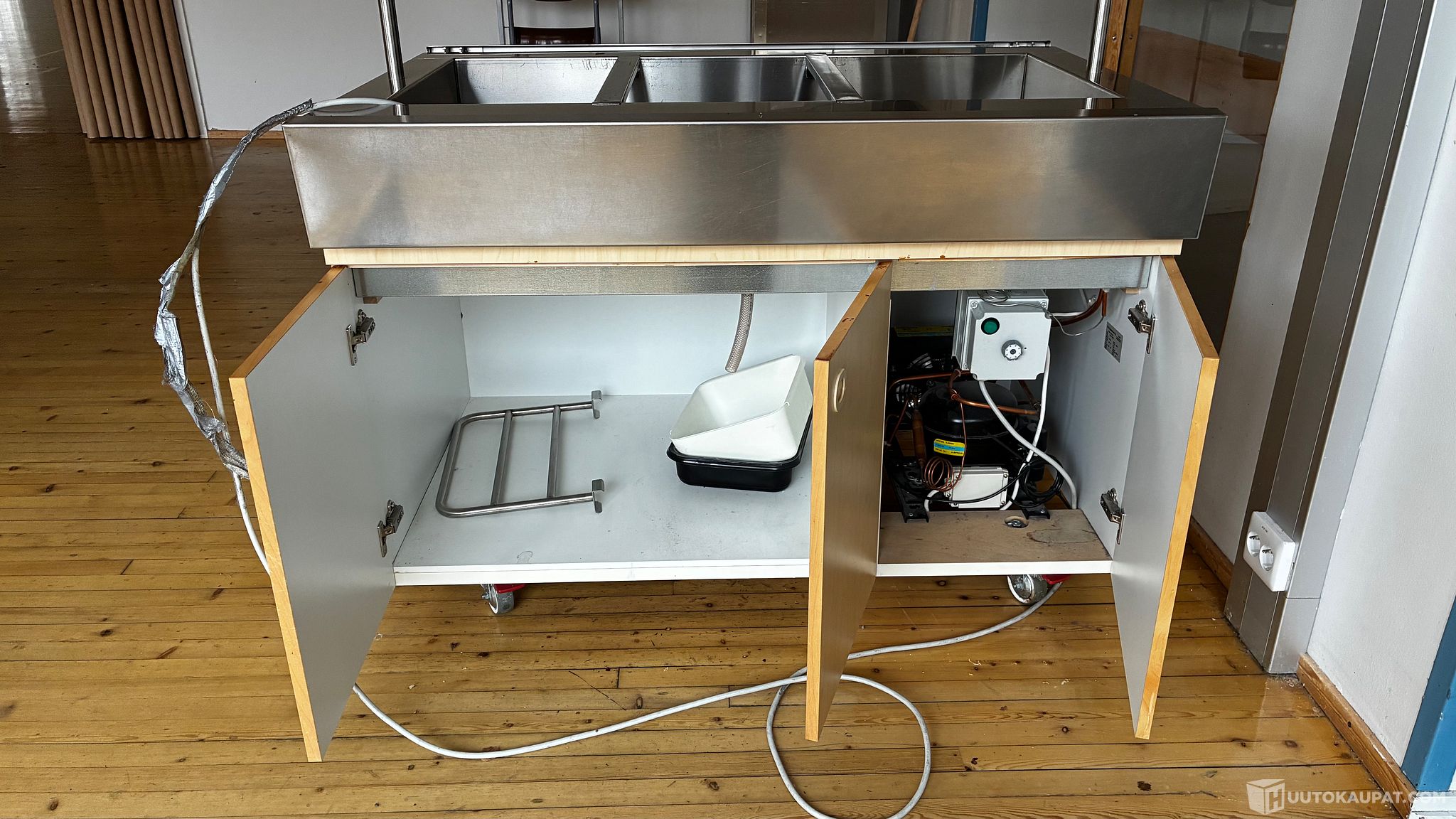 Metos kylmäallas. Ollut käytössä vuoteen 2021, jonka jälkeen toimivana poistettu käytöstä ja sen jälkeen säilytetty lämpimässä. Ajan tuomaa patinaa näkyvissä, mutta yleiskunto siisti. Johto on ehyt, ollut teipattuna lattiaan.