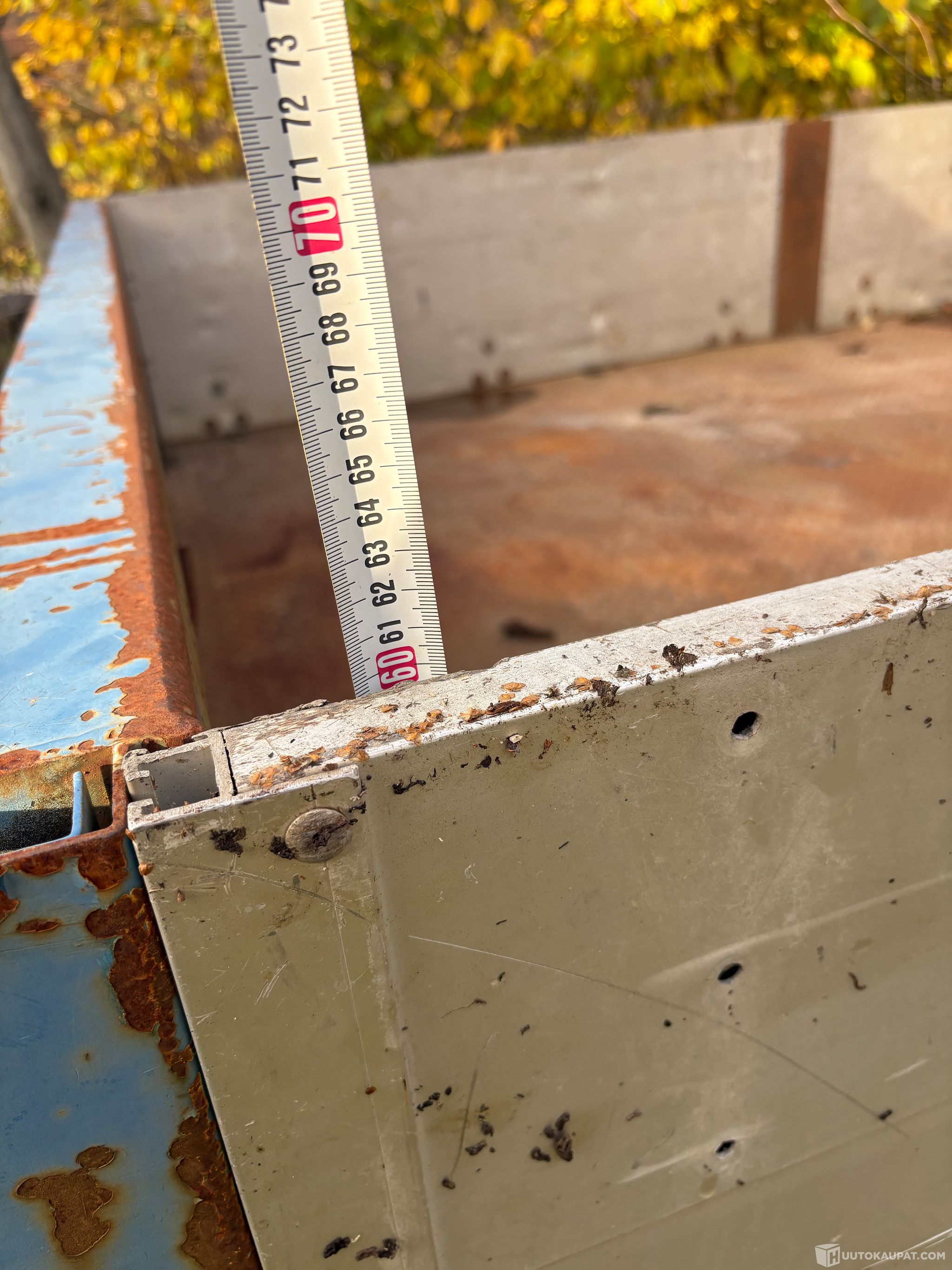 Vanha, kolhiintunut, kiinnityksiä irti, laitojen lukkotolppien kahvoja vaurioitunut, ruostetta