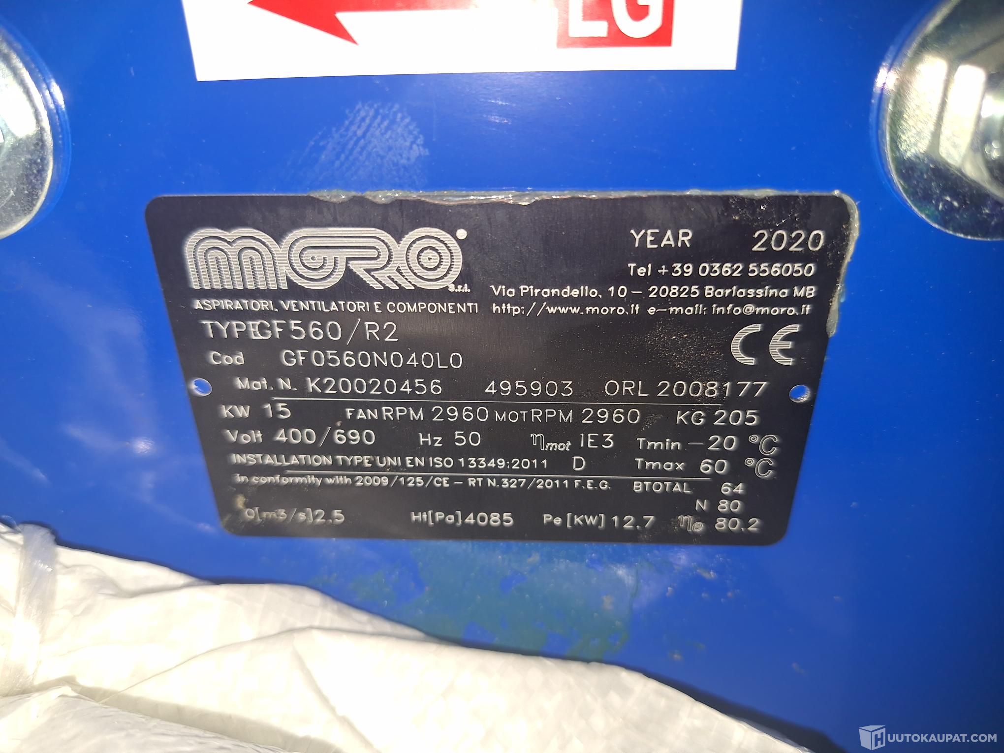Tarjolla Moro GF560/R2 -mallinen kanavapuhallin/lietso. Puhallin on suunniteltu pienille ja keskisuurille ilmamäärille, joissa tarvitaan korkeaa painetta.