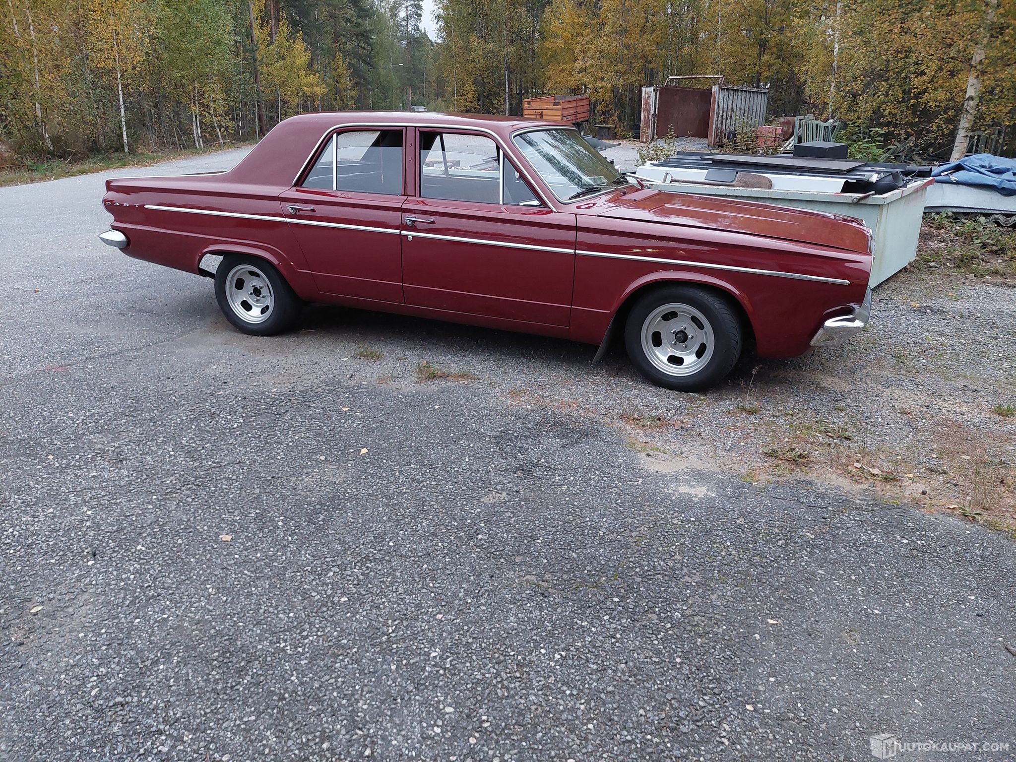 Kohtuu hyväkuntoinen Dart. Ollut ajamatta n. 8 vuotta. Säilytetty kylmässä varastossa, kuitenkin kuivassa ja säältä suojassa. Tekniikka: 225 slant, tf904 vaihteisto, 7 1/4 perä. Kaikki läpikäyty aikoinaan.