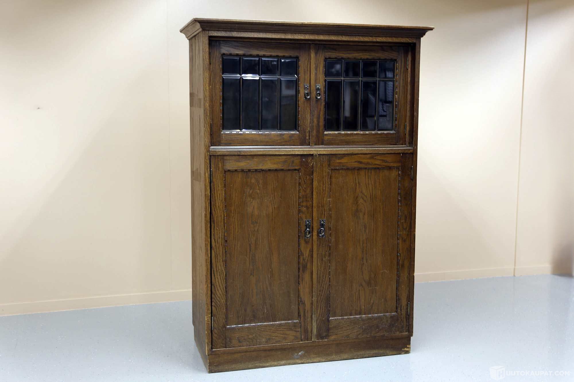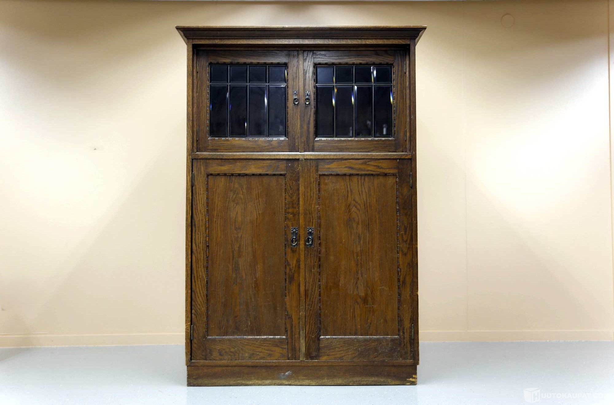 Massiivipuinen kaappi, 1900-luvun alkupuolelta. Yläosassa lyijylasi-ikkunat, alaosassa umpinaiset ovet.