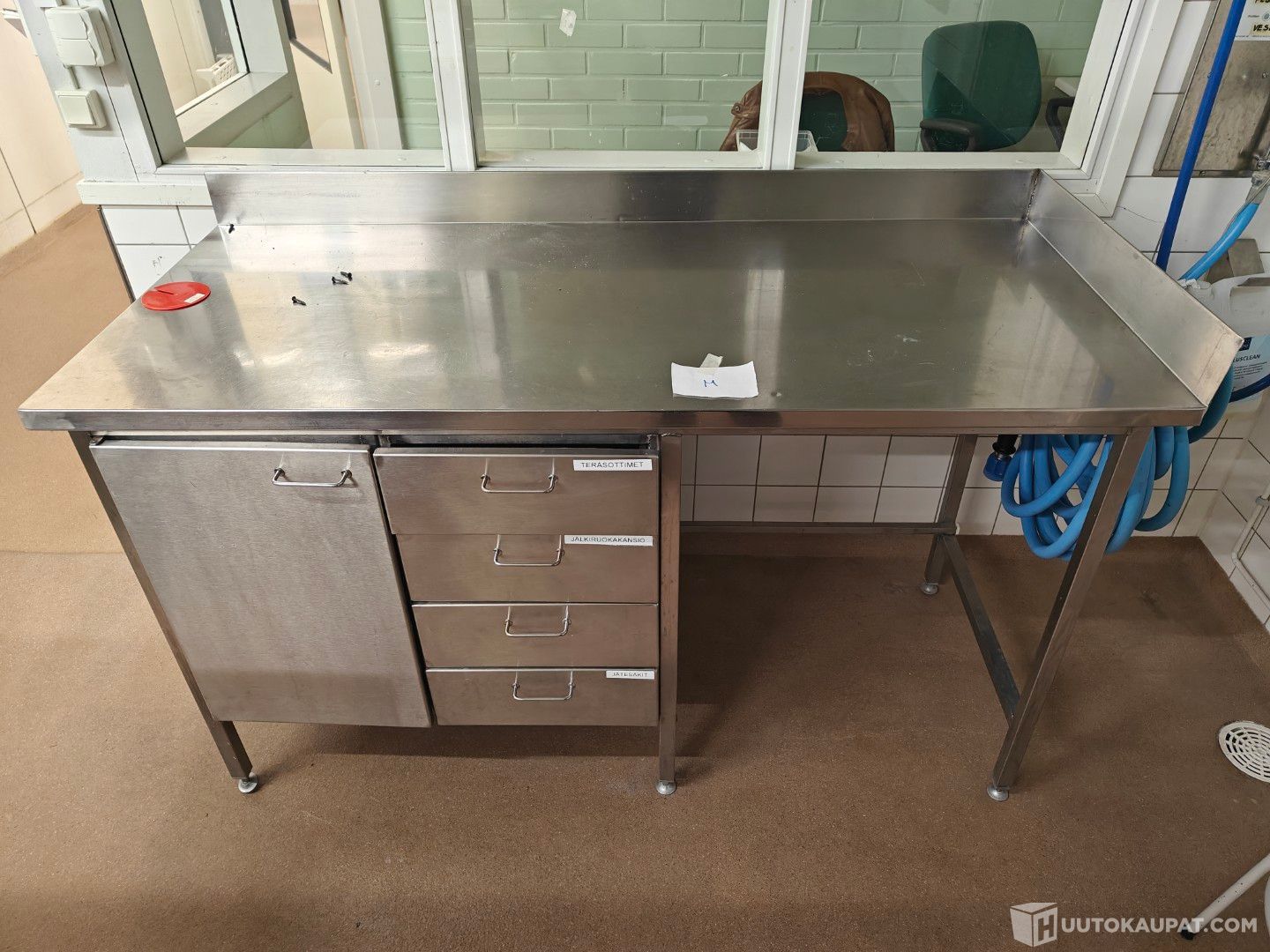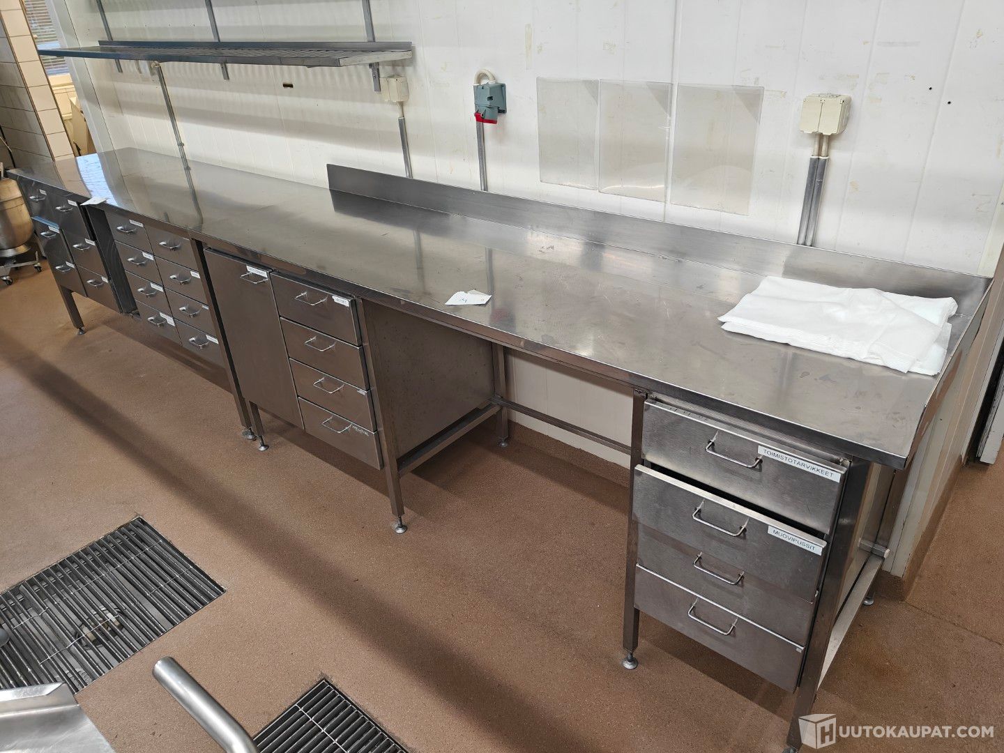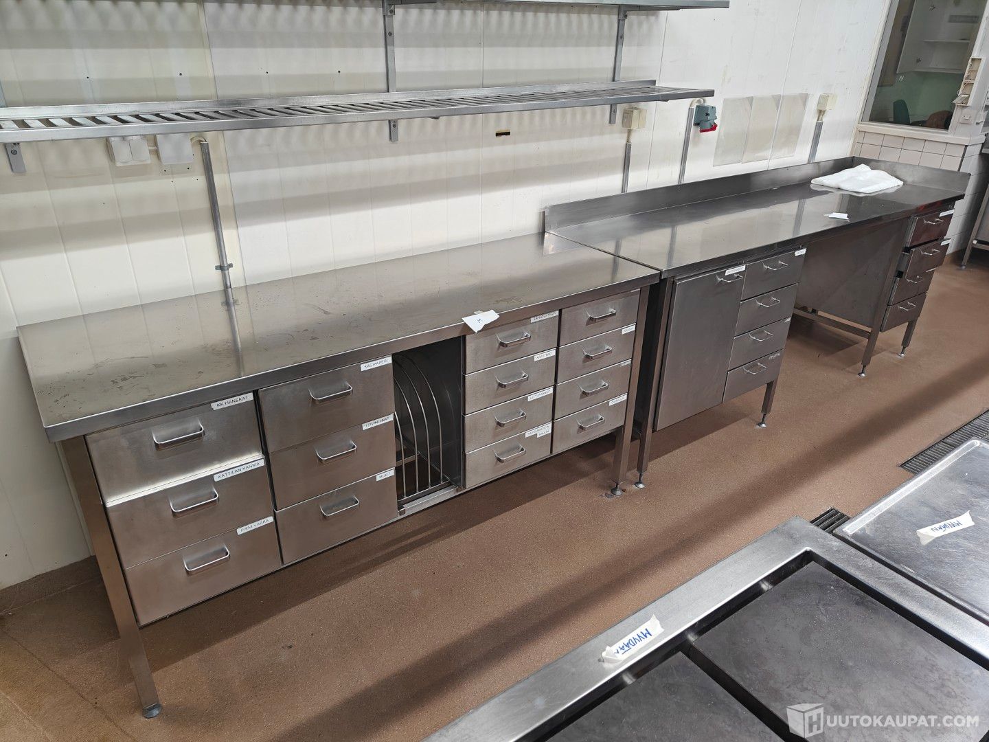 -pöydissä laatikostoja ja kahdessa myös yksi kaappi