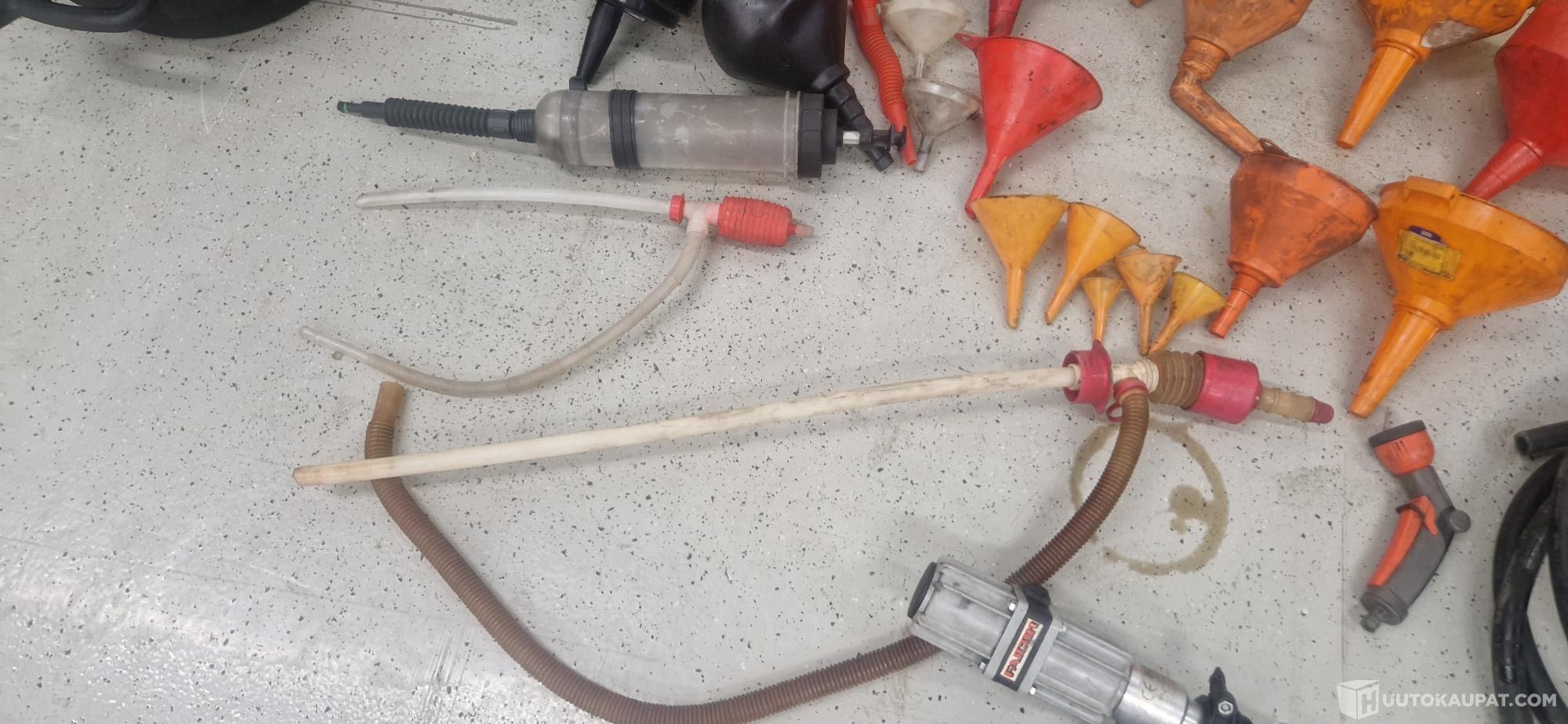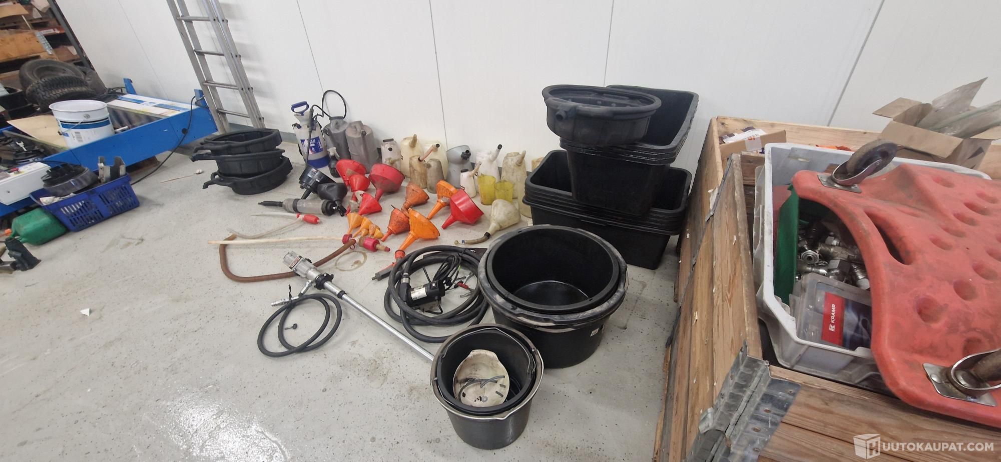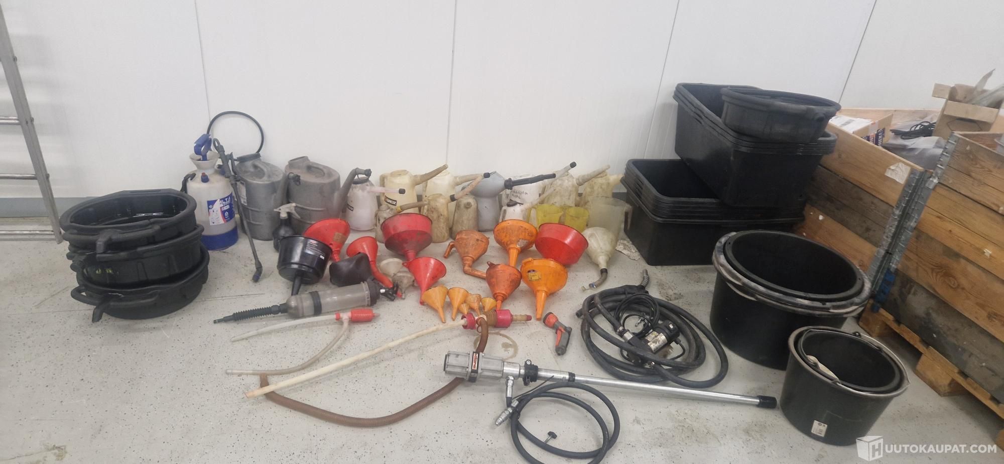 kuvien mukainen ISO läjä tarvikkeita.mm. mittakannuja, ratteja, valutusastioita, paineilma öljypumppu, polttoainepumppu sähköinen