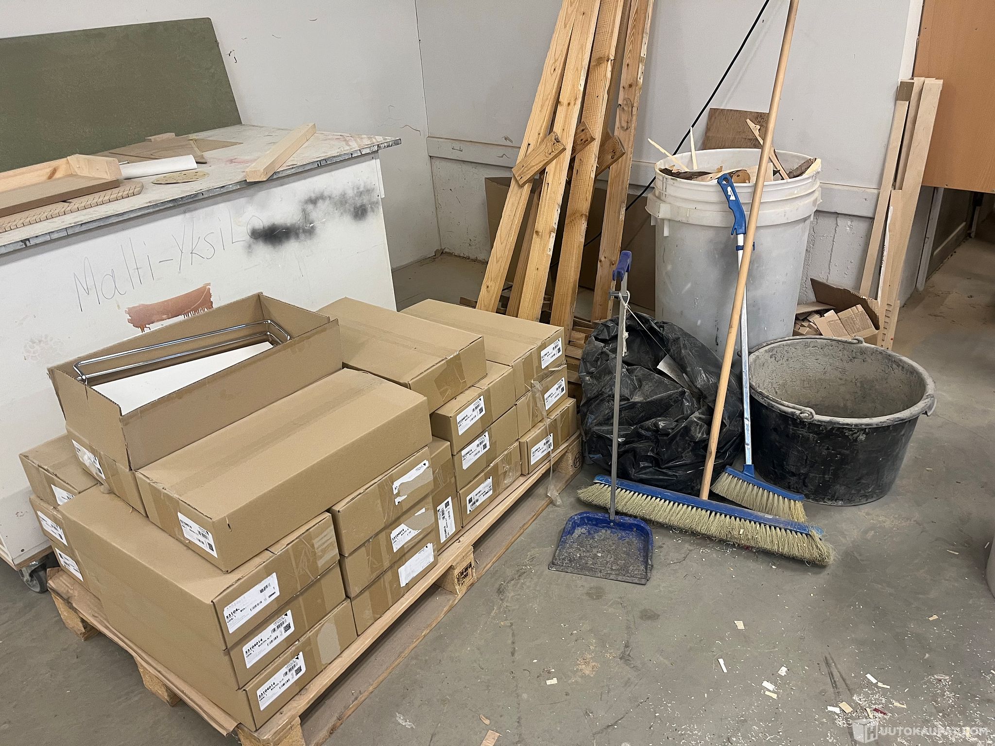 KUVIEN MUKAINEN VARASTON TYHJENNYS LEVYTAVARAA, PÖYTIÄ, HITSAUSKONEET, KOMPRESSORI ym