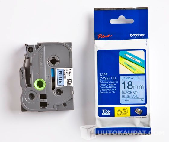Brother TZe-641 -tarranauha, 18 mm leveä laminoitu nauha mustalla tekstillä ja sinisellä pohjalla, 8 metriä.