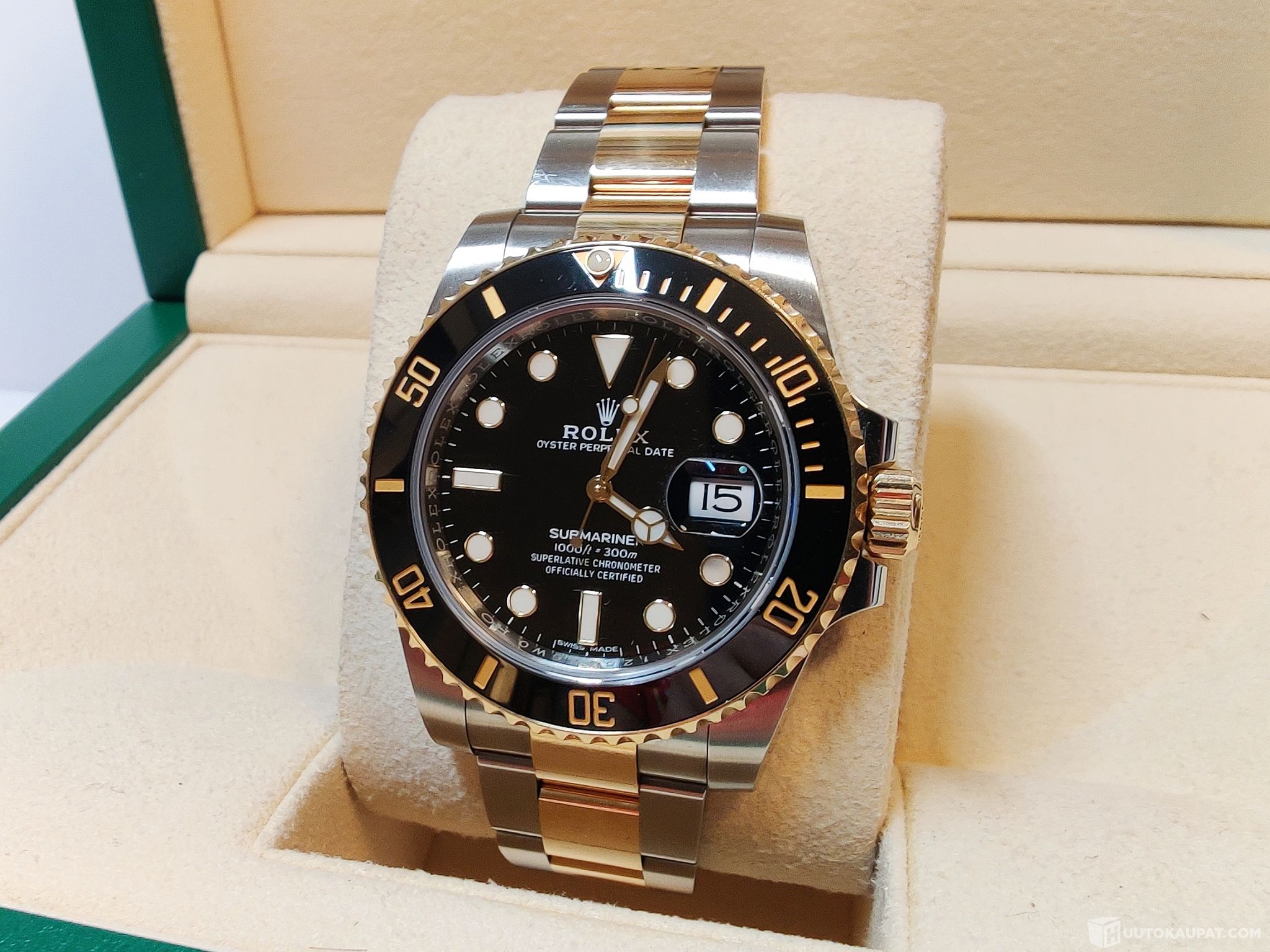 Todella tyylikkäästi päivitetty Rolexin klassikkomalleihin lukeutuva teräs/kultainen Submariner Date. Uudempi malli jossa pidempi lukkomekanismi helposti säädettävällä liukulukituksella. Tässä mallissa jykevämpi näyttävämpi kuori (maxi case) ja naarmuuntumaton keraaminen bezel.