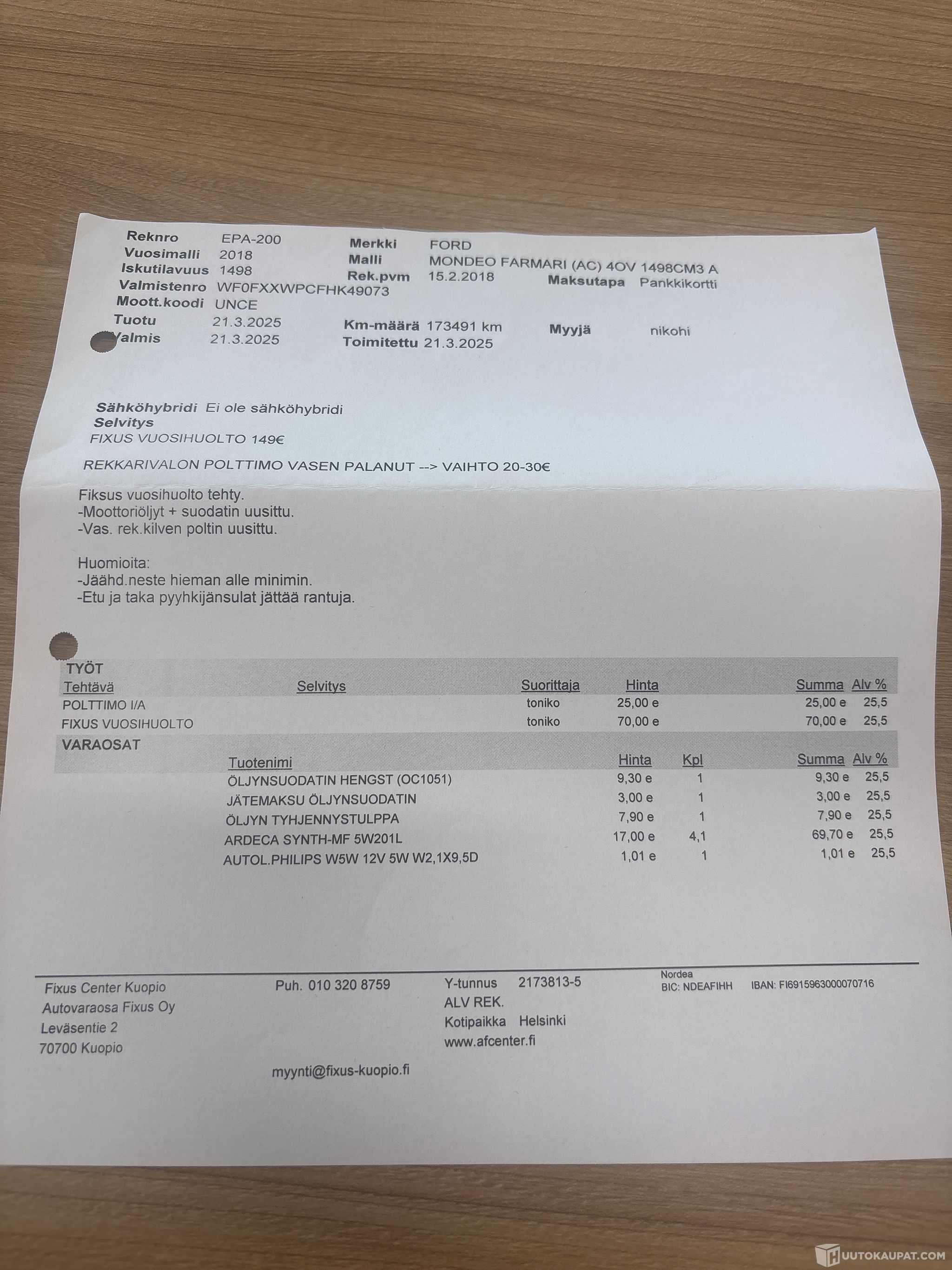 • Viimeisin huolto 3/2025 173tkm kohdalla. Huoltoväli 12kk tai 20tkm