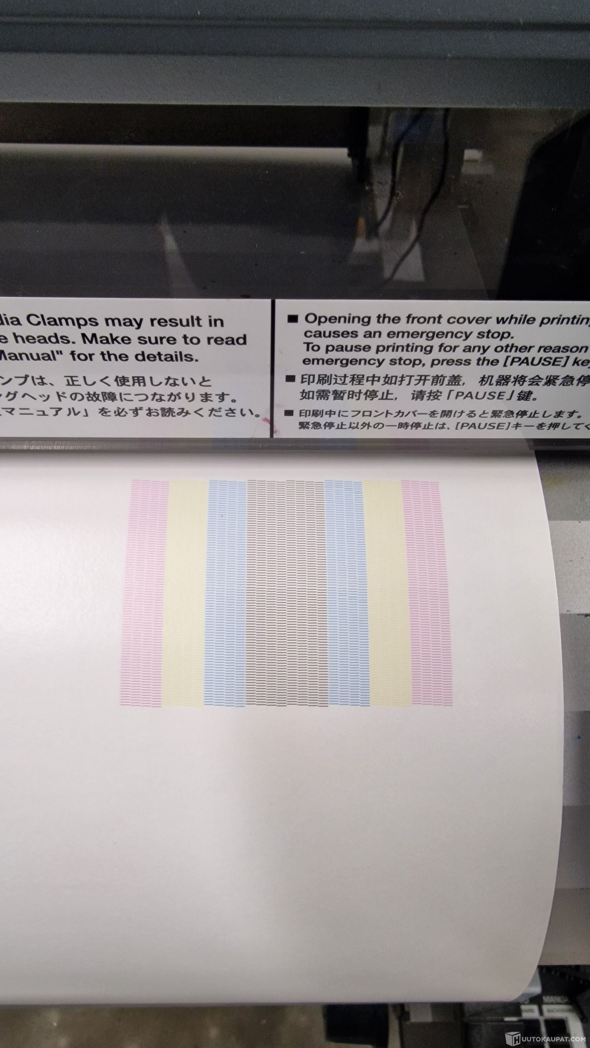 Toimiva suurkuvatulostin ja leikkuri, tulostaa virheettömön testiruudukon.