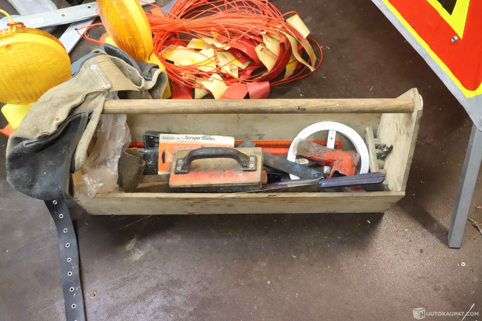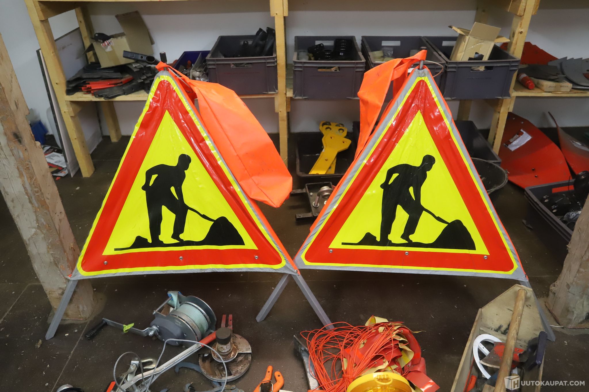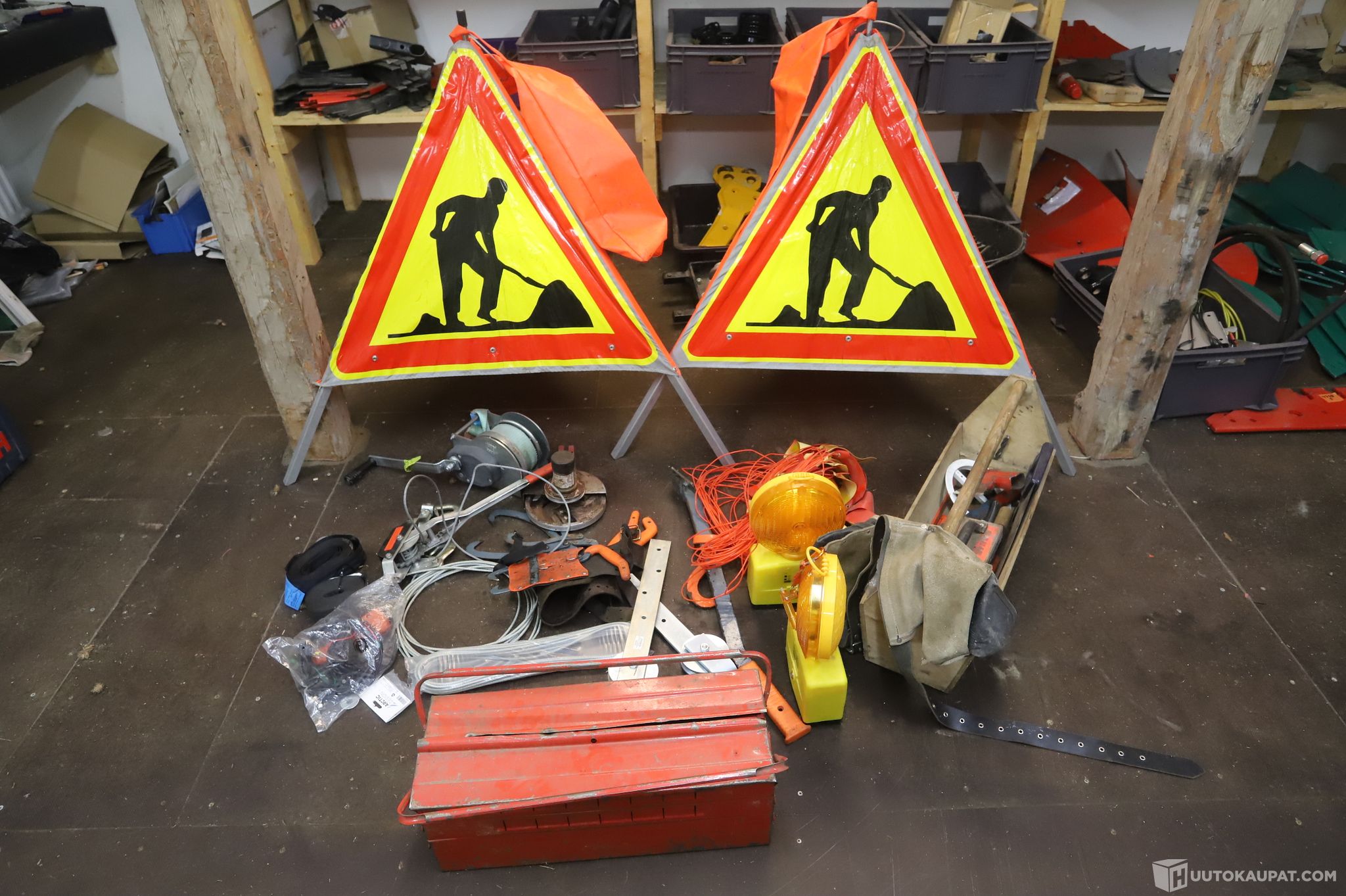 Kaikki työmaamerkkien edessä olevat tavarat kuuluvat huutoon, muut taustalla näkyvät tavarat eivät.