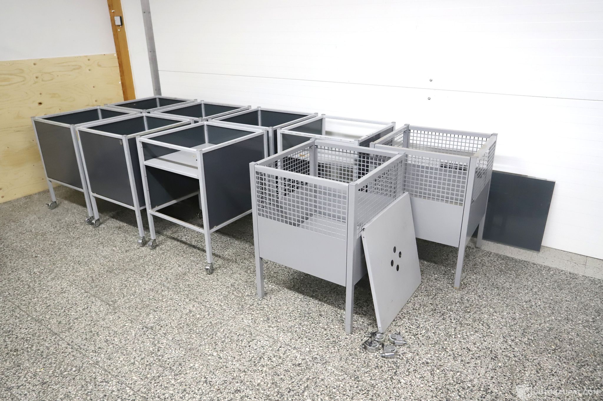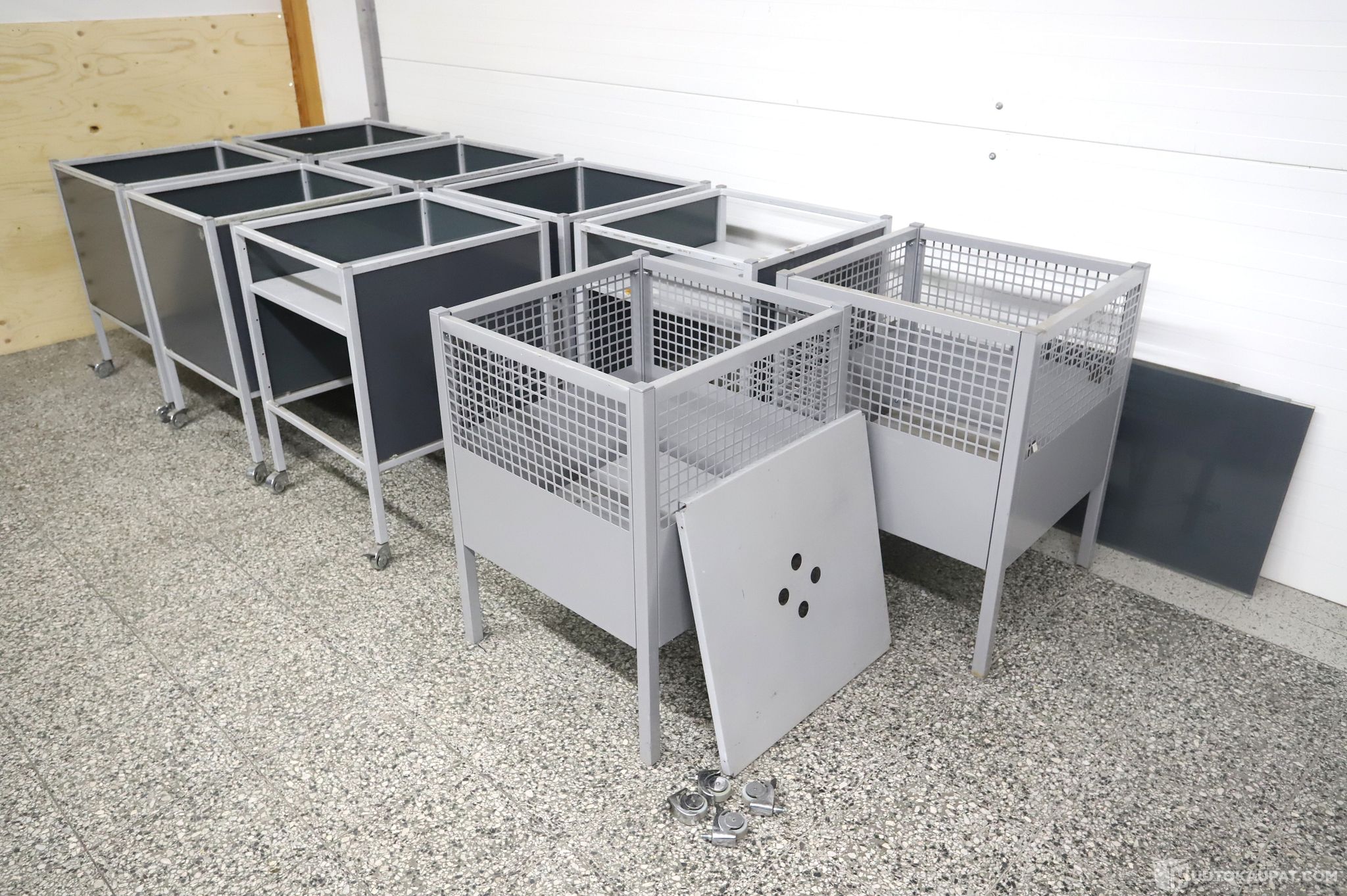2 kpl harmaita myymäläkoreja. Toiseen on rullat ja toiseen ylimääräinen taso.