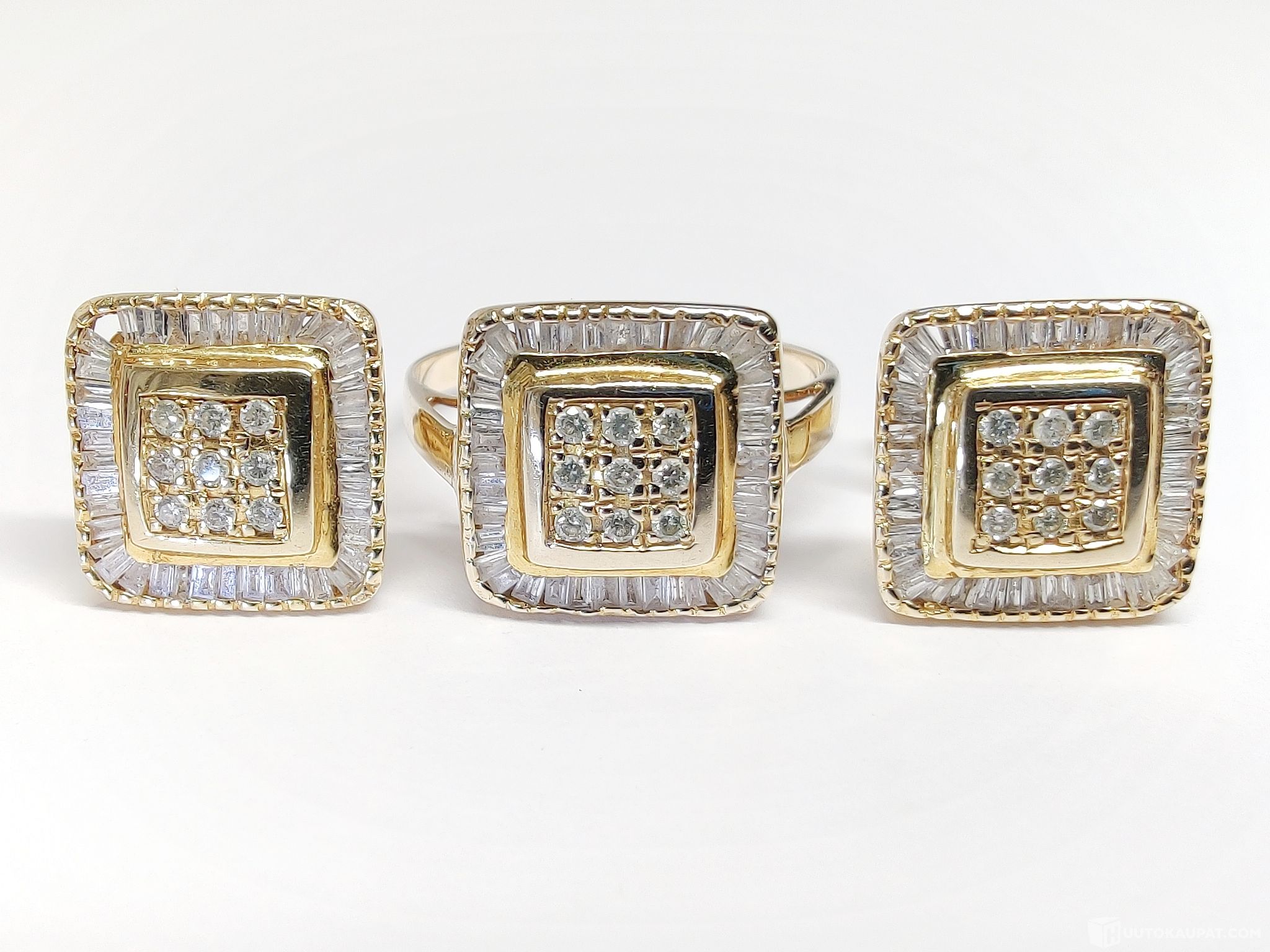 Todella näyttävät timanttikorvakorut sekä -sormus 450 kultaa (n. 11k).