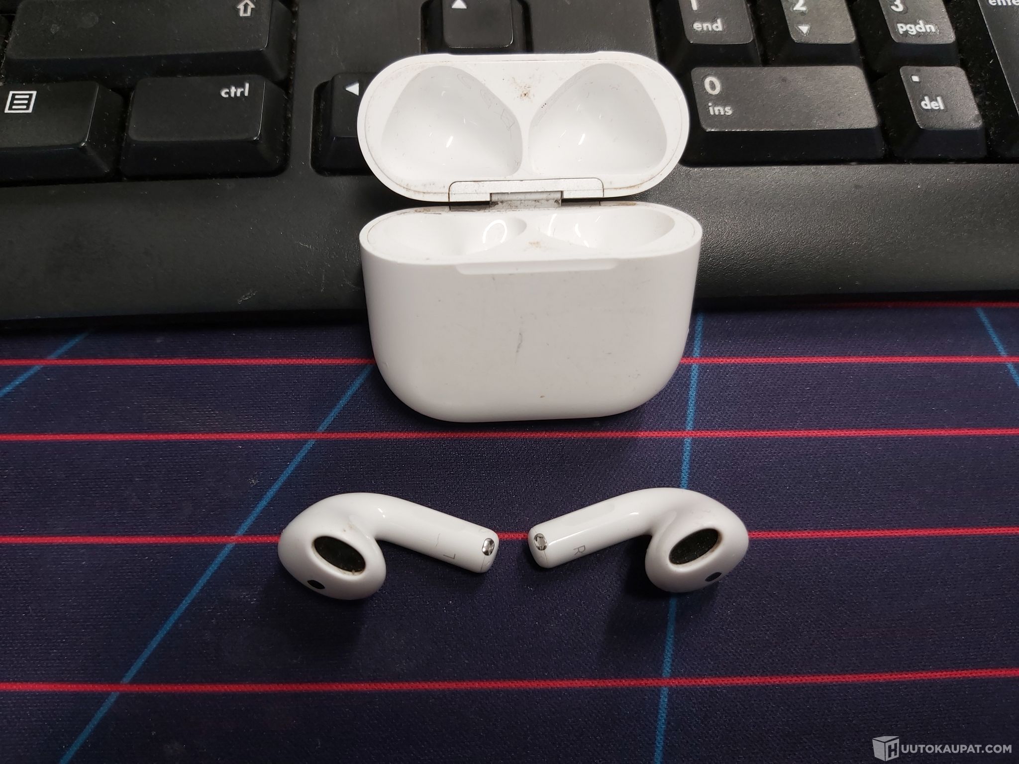 Käytetyt, mukana napit, latauskotelo ja laturi.