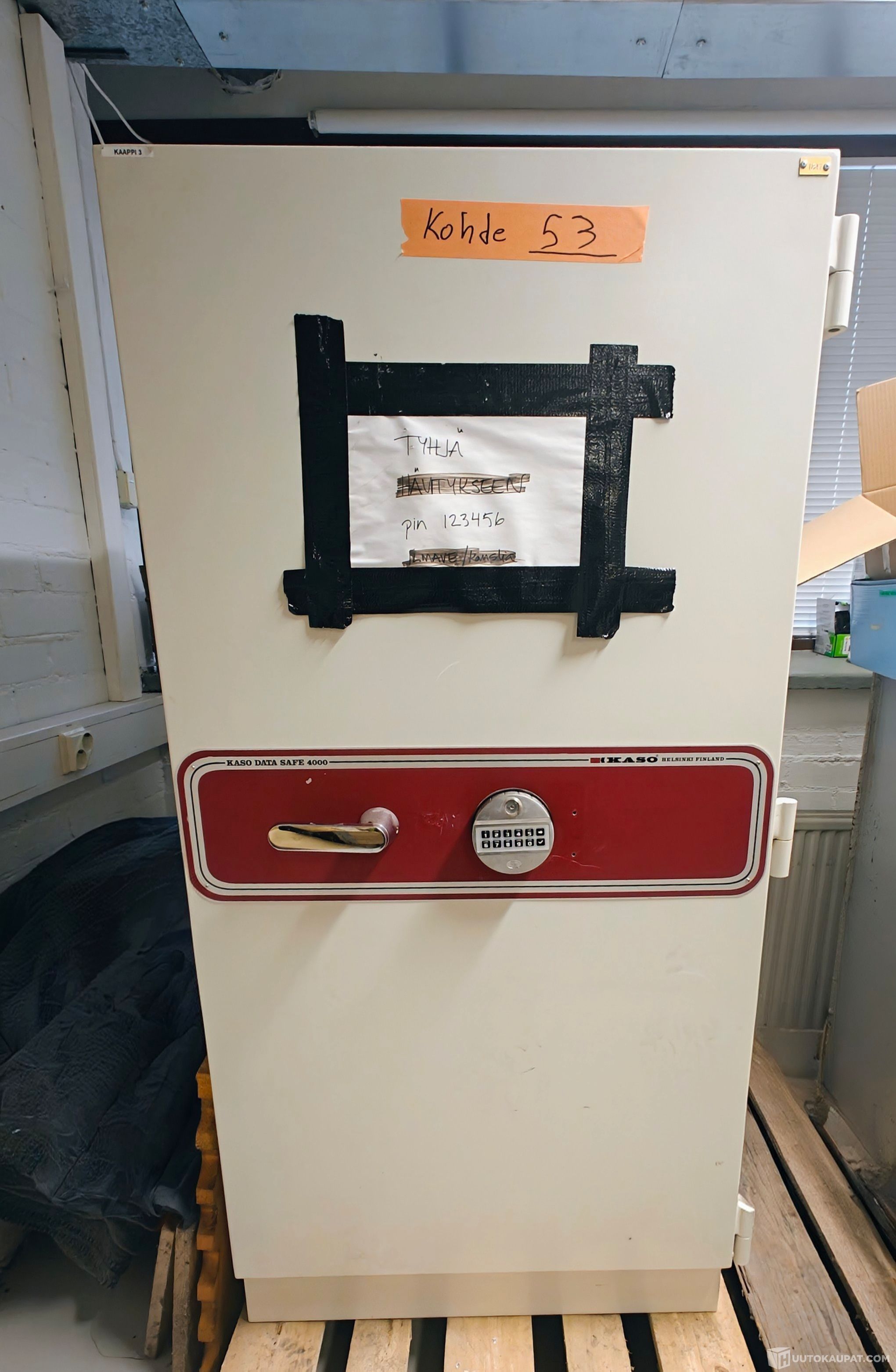 Kohde myydään romuna oheisten valokuvien perusteella eli vain kuvissa näkyvä kassakaappi. Huudon kohteeseen kannattaa tutustua paikanpäällä. Katso kohta havaitut viat.