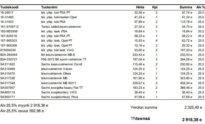 Liitteenä PDF lista tavaroista ja viimeisenä kuvana myös lista, jossa OVH hinnat näkyvissä.