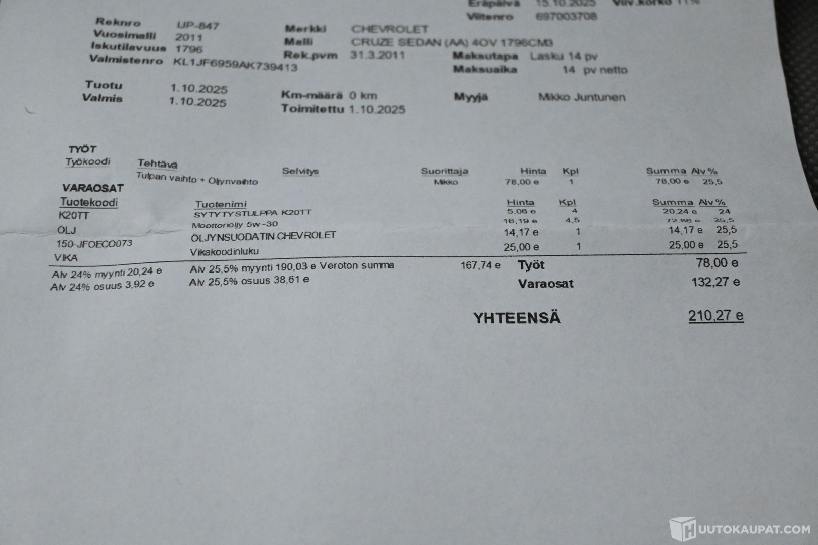 Öljyt ja sytytystulpat vaihdettu 1.10.2025