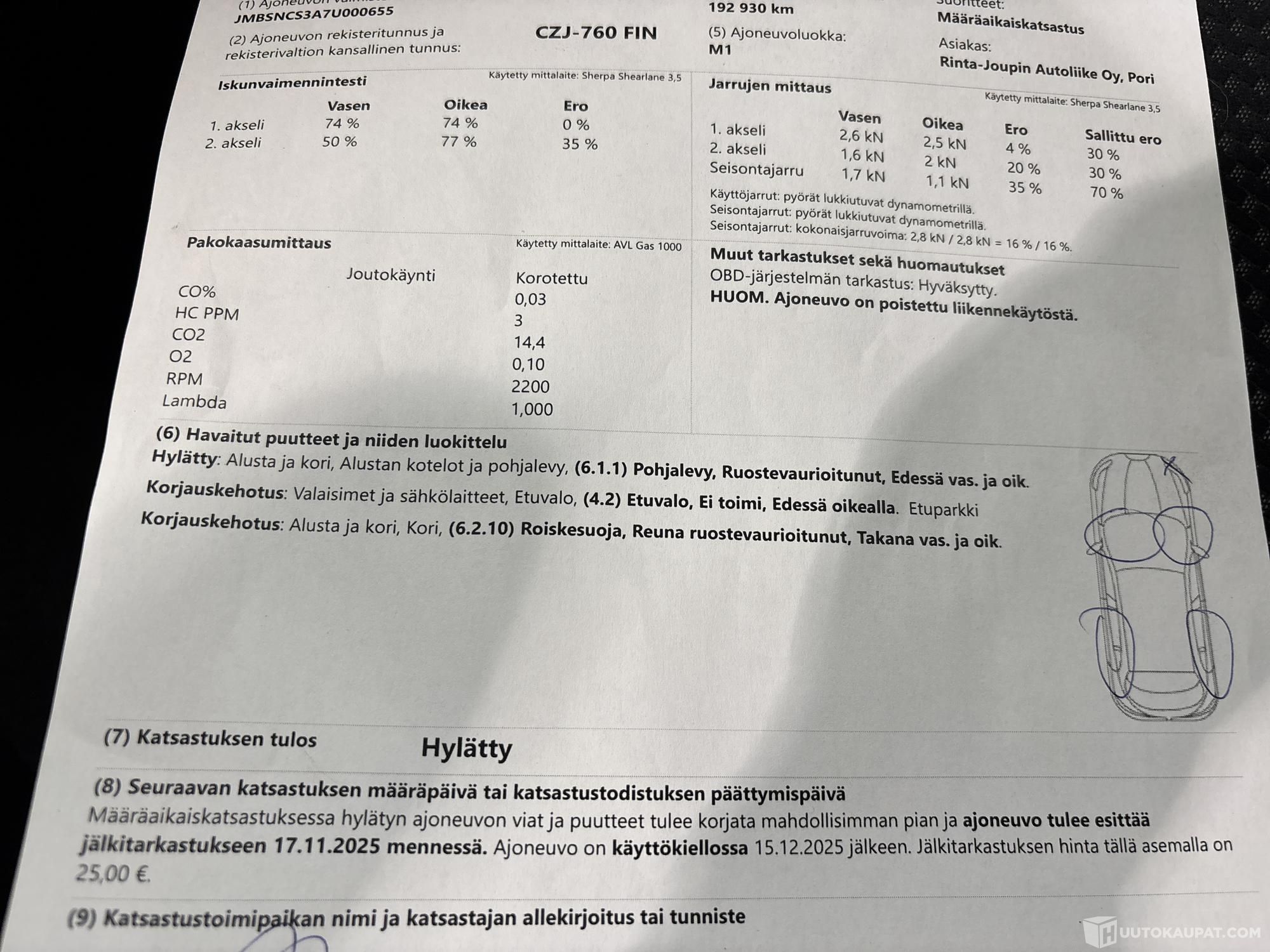Korjauskehotuksia: etuvalo oikea, roiskesuoja ruoste takana vas&oik
