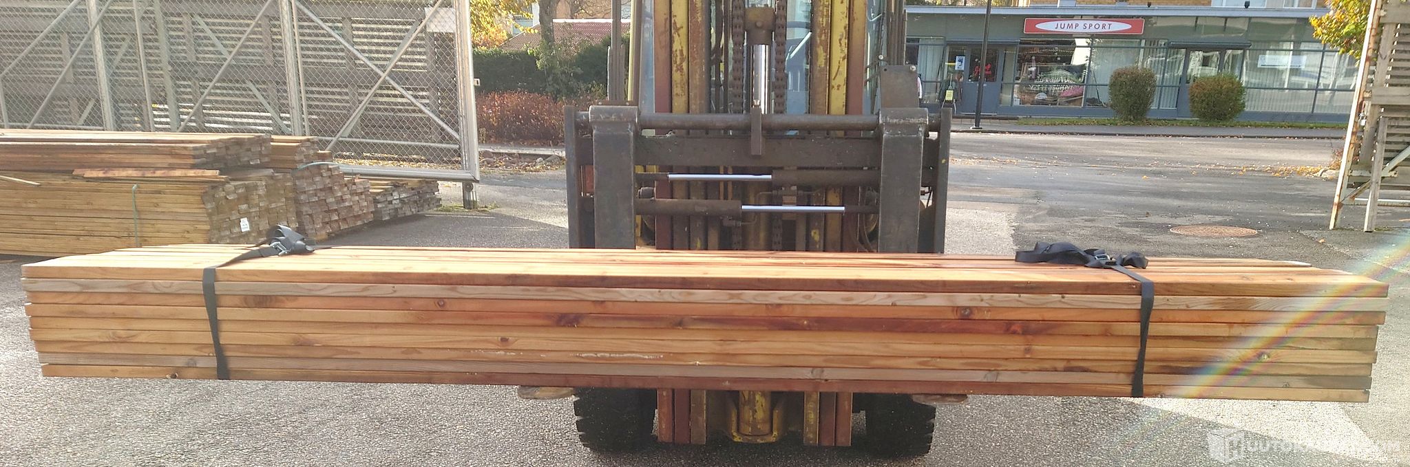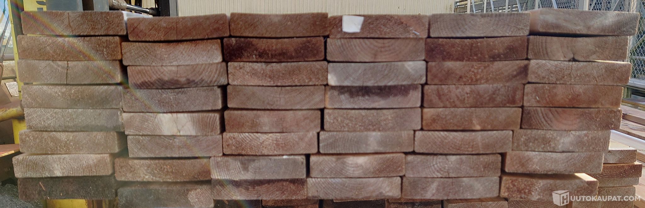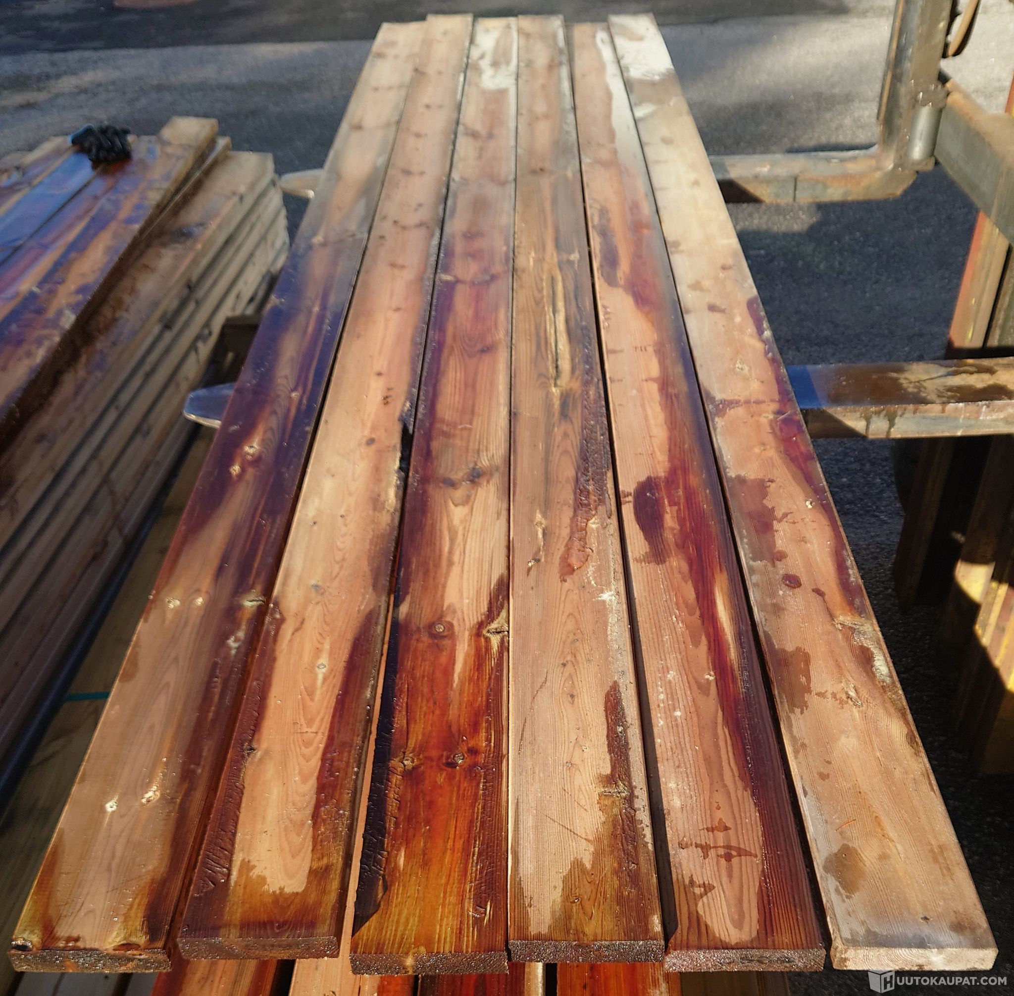 Kuvin esitetyt 28x120 mm ruskeakyllästetyt sileähöylätyt 28x120 mm II-laadun terassilaudat. Jokaisen laudan laatu näkyy kuvissa. 54 kpl a' 3 m, yhteensä 162 m, jolla kattaa noin 19 neliön alan 2–3 mm raolla. Oksaiset laudat ovat täyssärmäisiä ja suoria. Märkyyden vaihtelun takia väri on varsin kirjavaa. Väri tasaantuu lautojen kuivahtaessa.