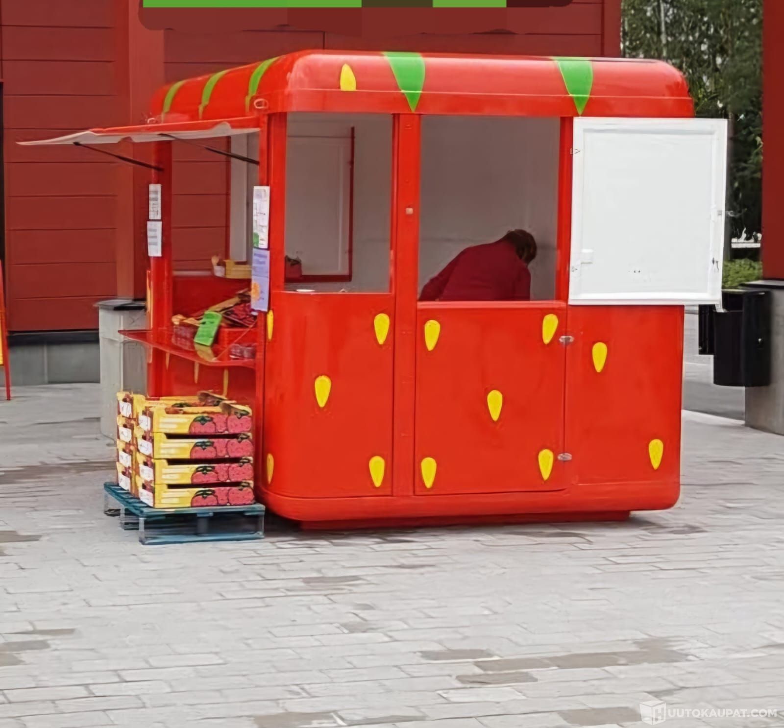 Siirettävä myynti koju. Koko 220×270 korkeus 260. Paino noin 250kg. Helppo sirtää vaikka pumppu kärillä.