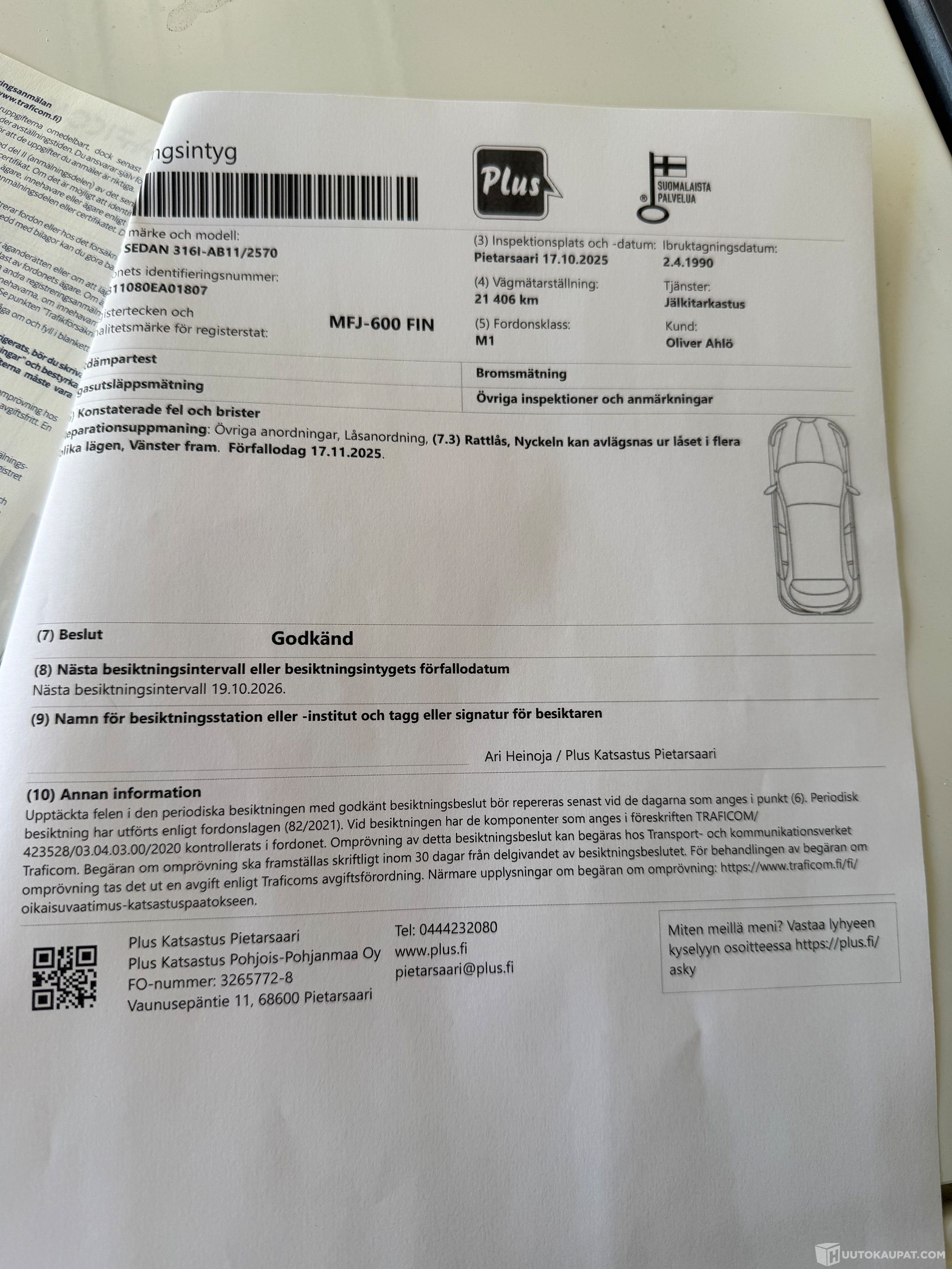 Auto on katsastettu 19.10.2026 asti, eli mitään kiireellisiä korjauksia ei ole. Se on täysin ajokunnossa ja toimii moitteetta. Kolme aiempaa omistajaa, ja selkeä huoltohistoria.