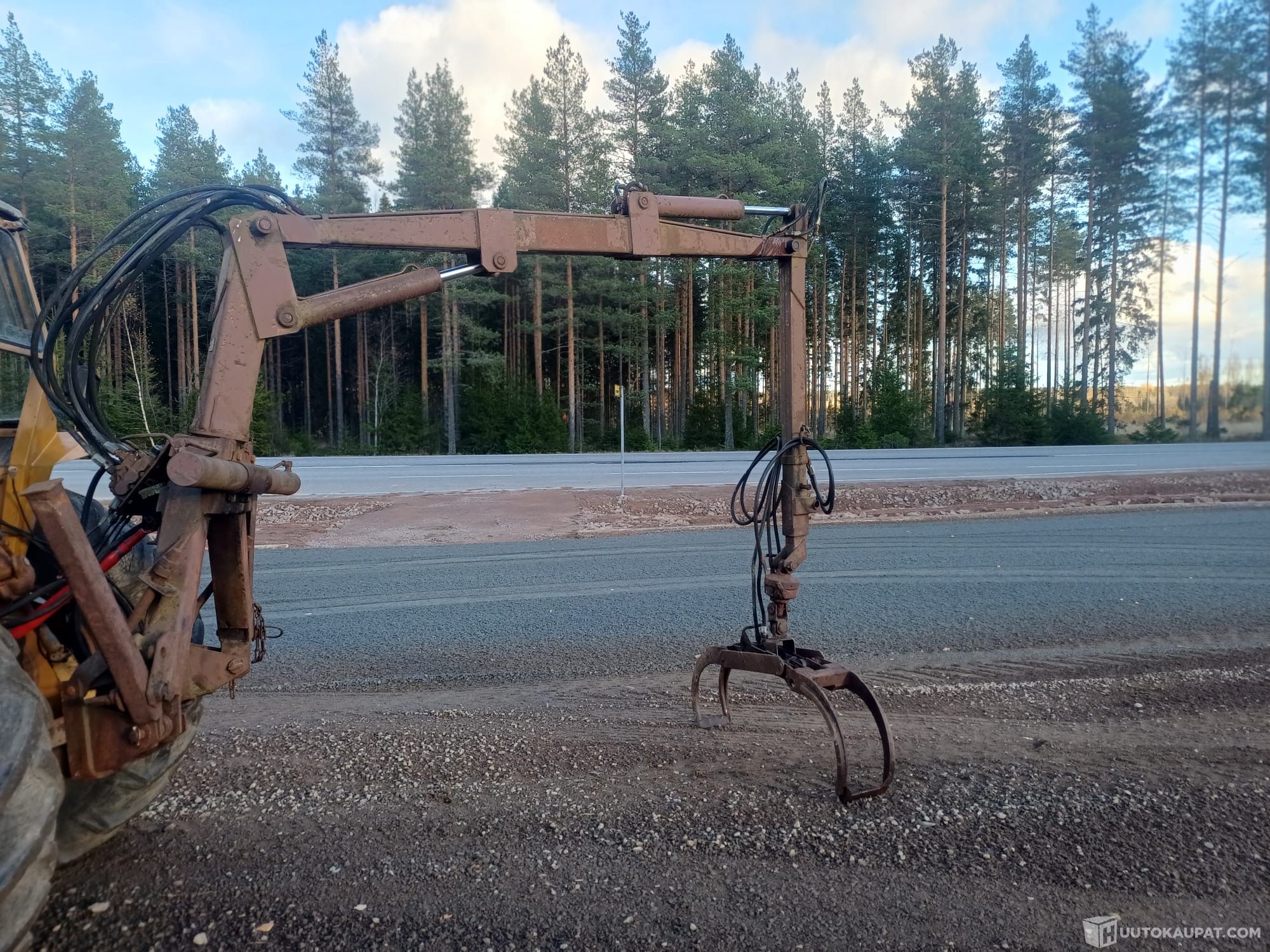 Myydään aikoinaan ylimääräiseksi jäänyt nokkakoneen tekemä puutavara kuormain.