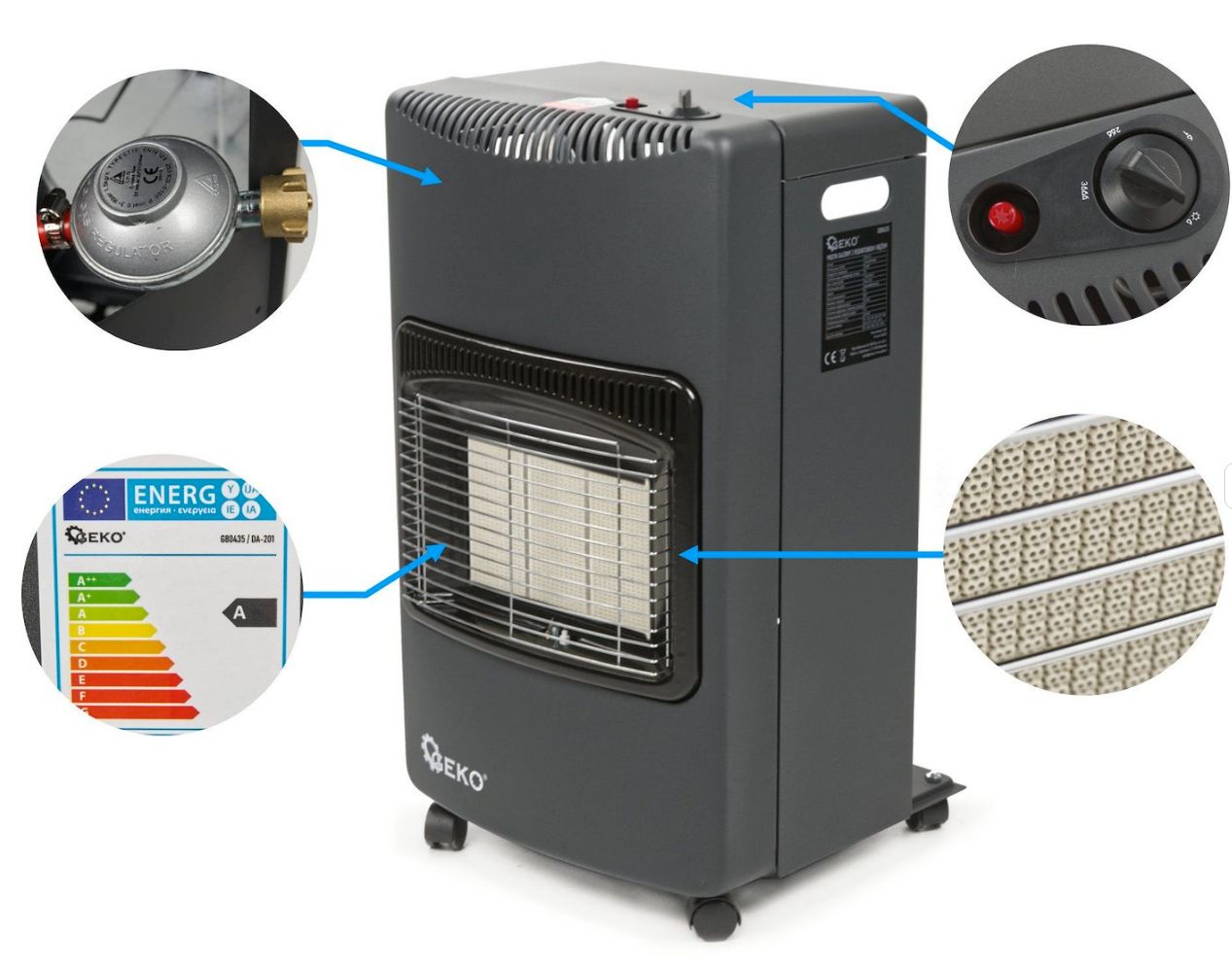 Tässä kaasulämmittimessä on säädin ja letku . Laitteessa on korkea 4,2 kW:n lämmitysteho. Se sopii erinomaisesti keskikokoisten huoneiden lämmitykseen. Lämmitin on varustettu termoelektrisellä turvalaitteella , joka katkaisee kaasun syötön välittömästi, jos palaminen keskeytyy. Siinä on kolmivaiheinen lämmitystehon säätö ja pietsosähköinen sytytin. Se on varustettu pyörillä, joiden ansiosta lämmitintä on helppo siirtää riippumatta siitä, onko pullo asennettu vai ei.