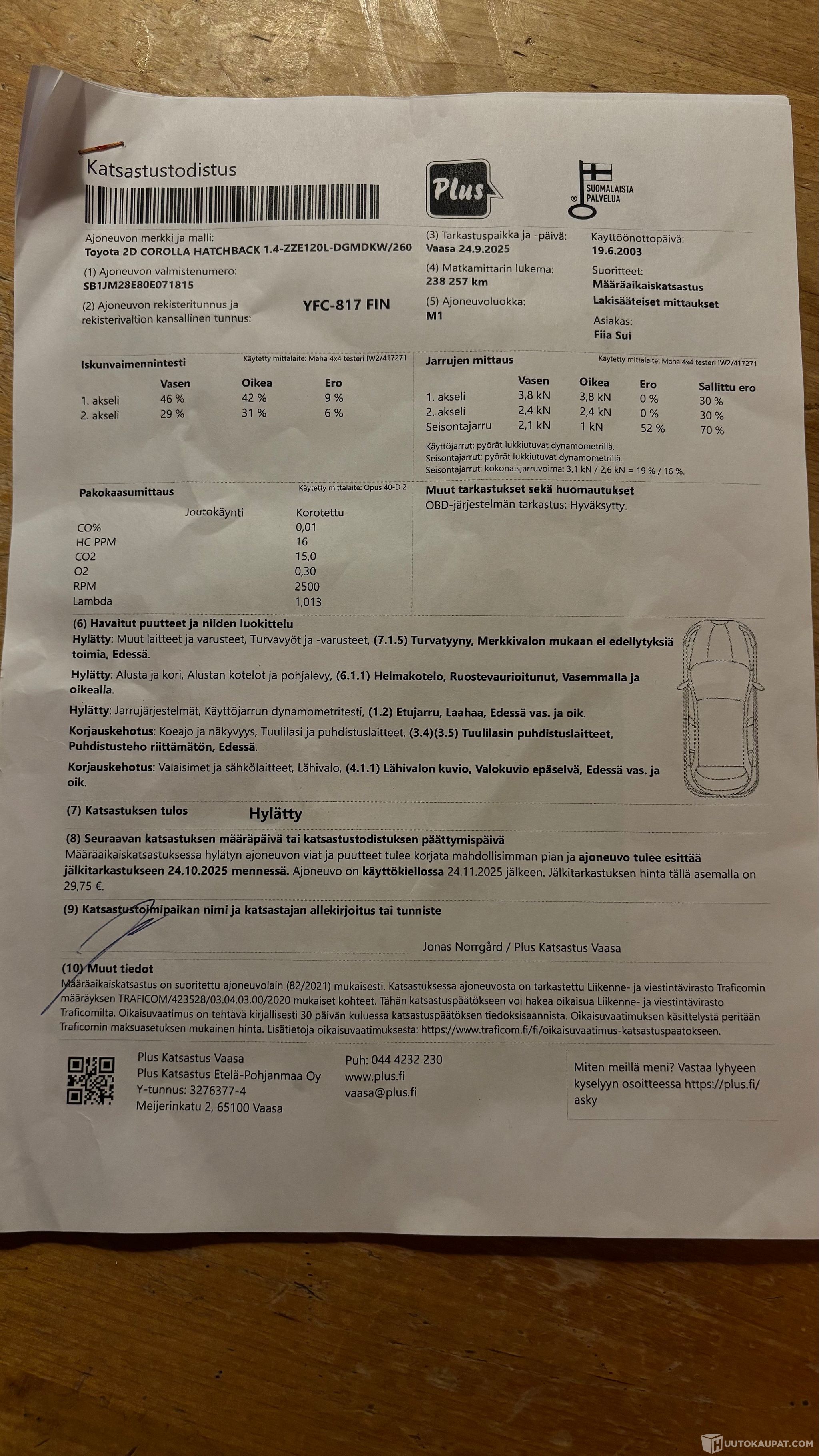 Katsastuksessa ilmi tulleet viat: etujarrut vas. ja oik. laahaavat (hylätty), helmakotelon ruostevauriot oikealla ja vasemmalla (hylätty), turvatyynyn merkkivalo palaa (hylätty), lähivalon kuvio epäselvä vas. ja oik. (korjauskehotus 24.10.2025 mennessä), tuulilasin puhdistusteho riittämätön (korjauskehotus 24.10.2025 mennessä).