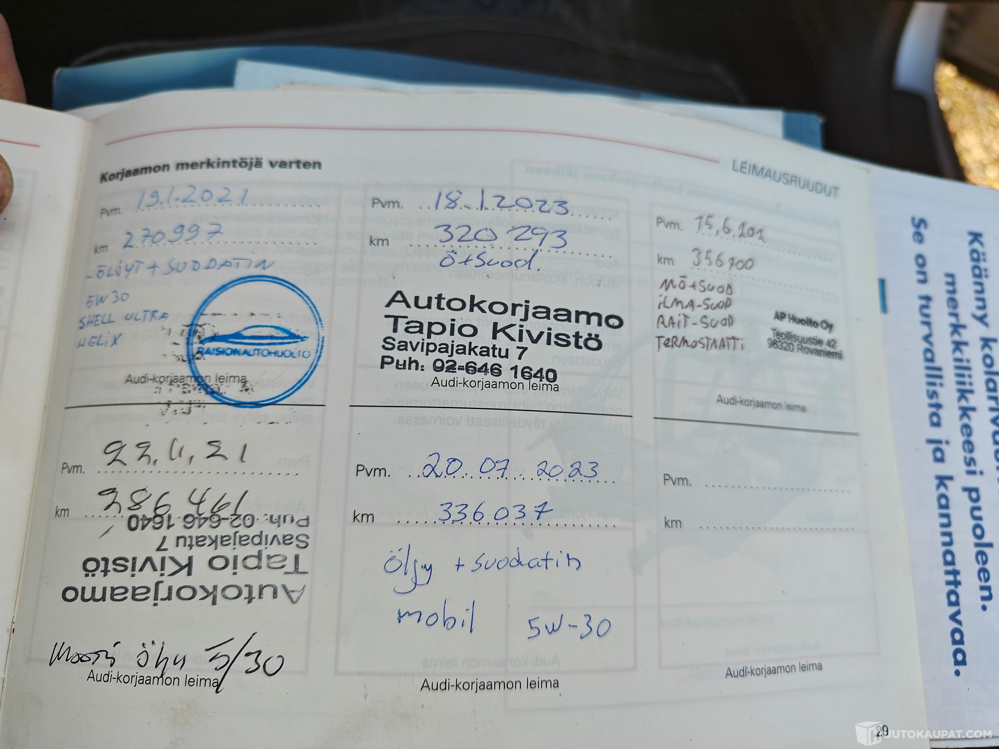 Vasta öljyt+suodatin, raitisilmansuodatin, ilmansuodatin ja termostaatti vaihdettu.