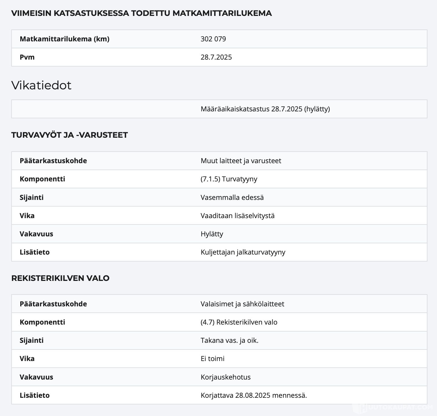 Katsastuksesta tullut hylätty: Kuljettajan jalkatilanturvatyynyn takia ja kehotus rekisterikilven valoista.