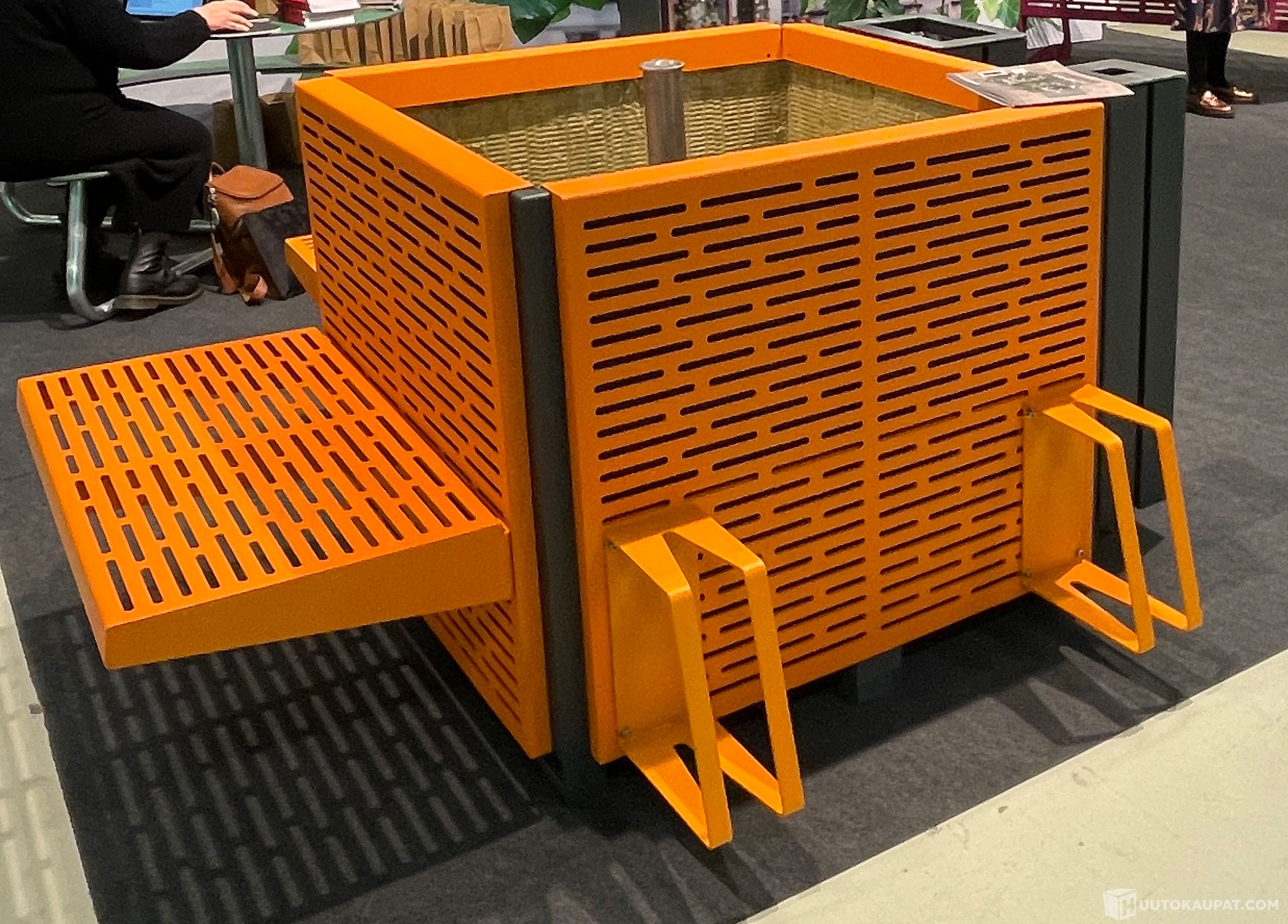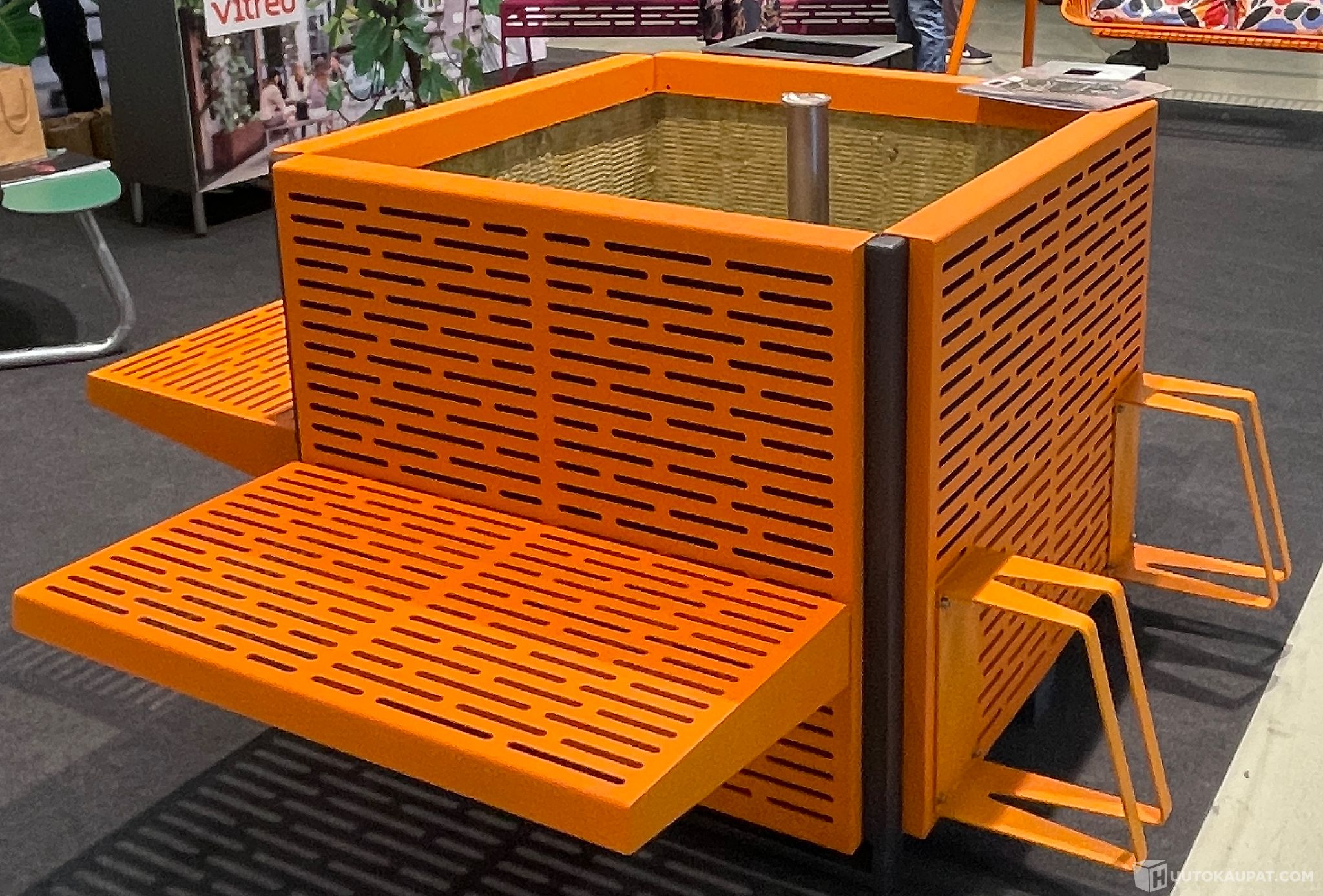 Taloyhtiöiden ja kiinteistöjen tarpeisiin sopiva suuri istutusastia johon sisältyy 2 kpl istuimia ja 2 kpl pyörätelineitä. Uutta vastaava tuote. Valmistettu Saksassa ja ollut esittelykäytössä Helsingissä kesän 2025. Tuote on tarkoitettu julkisille alueille mutta se soveltuu hyvin myös taloyhtiöiden ja kiinteistöjen piha-alueille. Kaikki osat ovat pulverimaalattua RST:tä, joten siten ne ovat säänkestäviä eikä tarvitsee poistaa talveksi. Kuvassa näkyvät oranssit sermit ovat irrotettavissa. Istutusastia soveltuu myös pienille puille ja sen koko on 100x100x80 cm. Astiassa on altakastelujärjestelmä sekä ylivuotoputket sadevedelle. Tästä erittäin näyttävä ja tuhansien eurojen kaluste eniten tarjoavalle. Myydään varastopoistona tilan ahtauden johdosta. Tuotetiedot sivuiltamme vitreo.fi