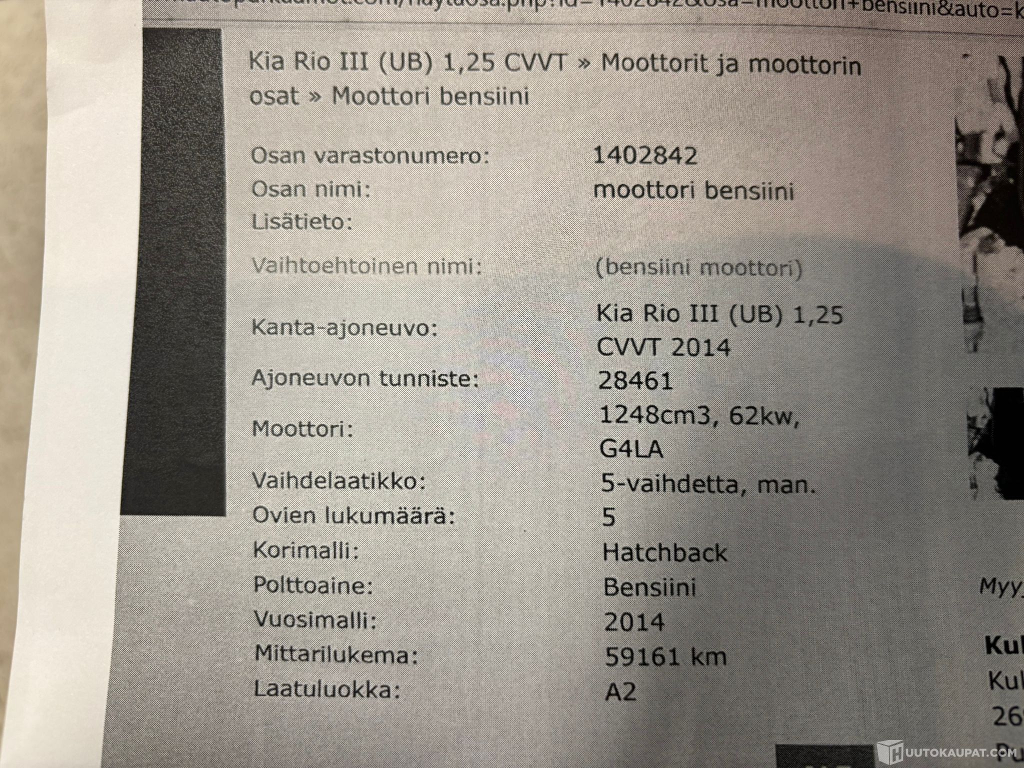 -Autoon vaihdettu moottori elokuussa. Moottori otettu n. 60tkm ajetusta Riosta.
