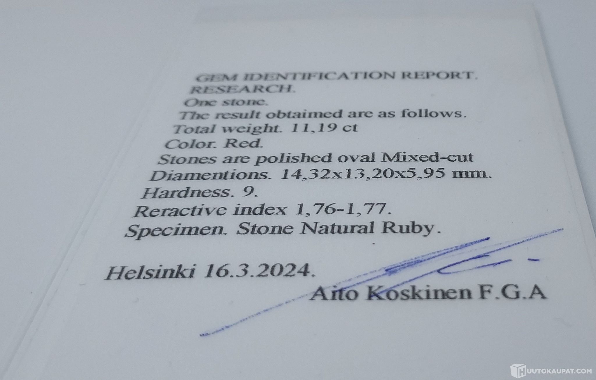 11,19Ct, Aito, Sertifioitu Rubiini, ISO, Helsinki