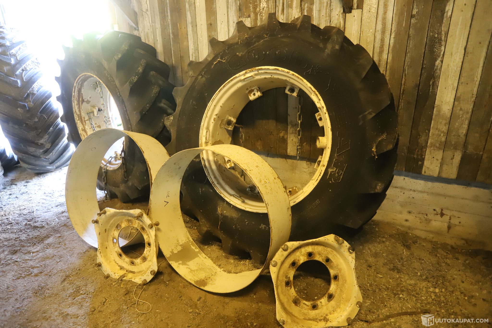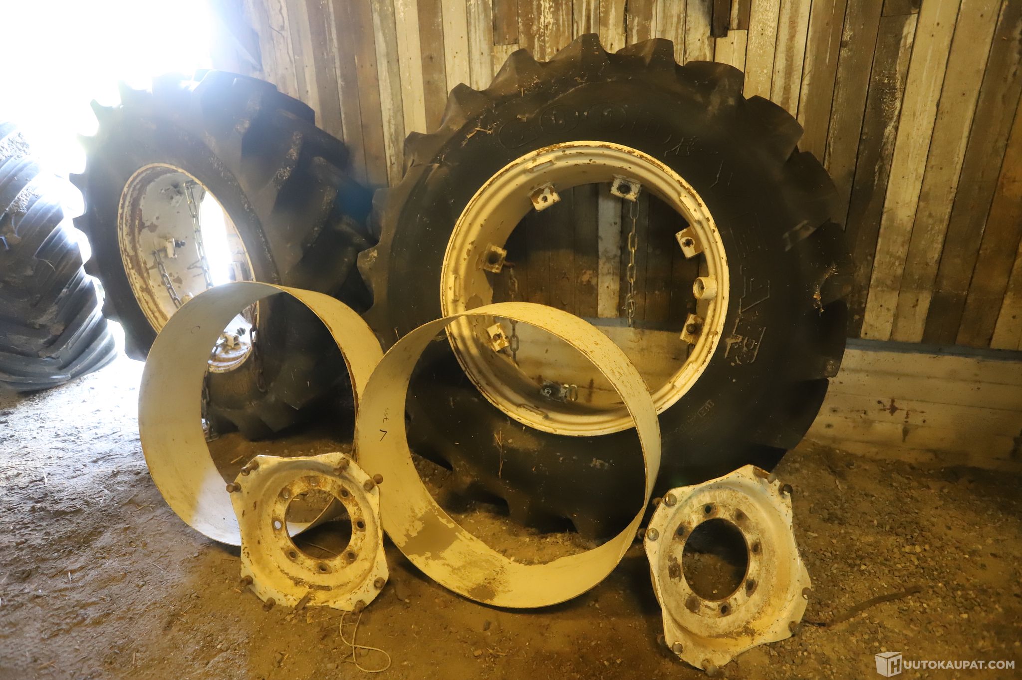 Vanhat käytetyt levikepyörät, säilötty katon alla kylmässä hämärässä varastossa.