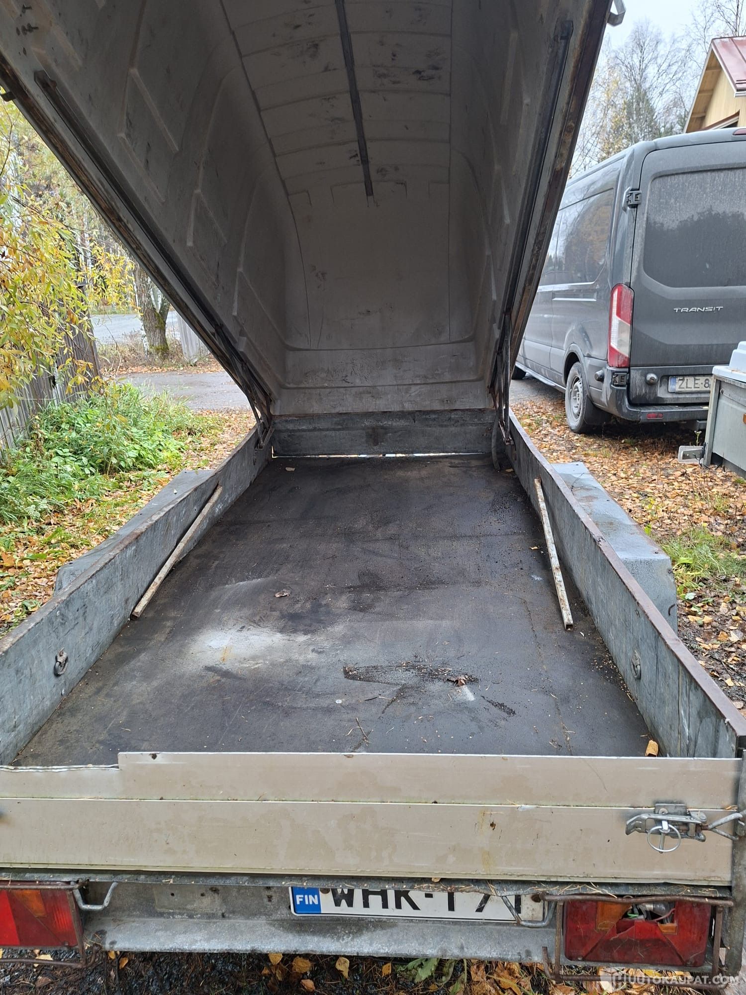 Jarruton, kippaava peräkärry. Hyvät renkaat.