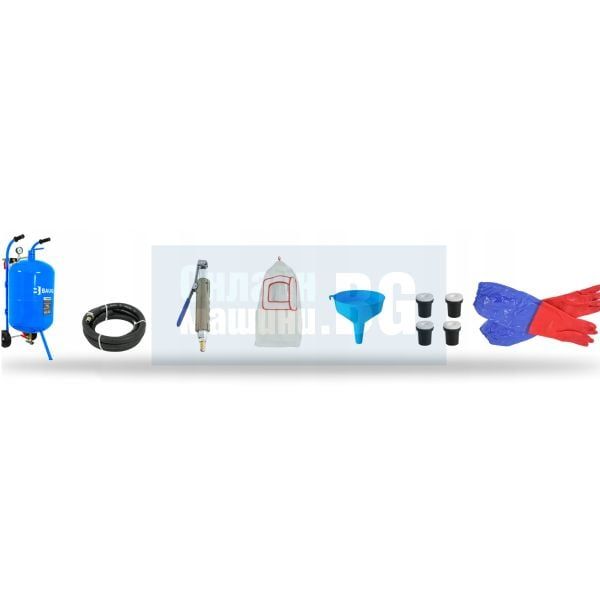 Pakkaus sisältää kaiken tarvittavan hiekkapuhallukseen. Liitä se vain kompressoriin ja kaada hiekka säiliöön.