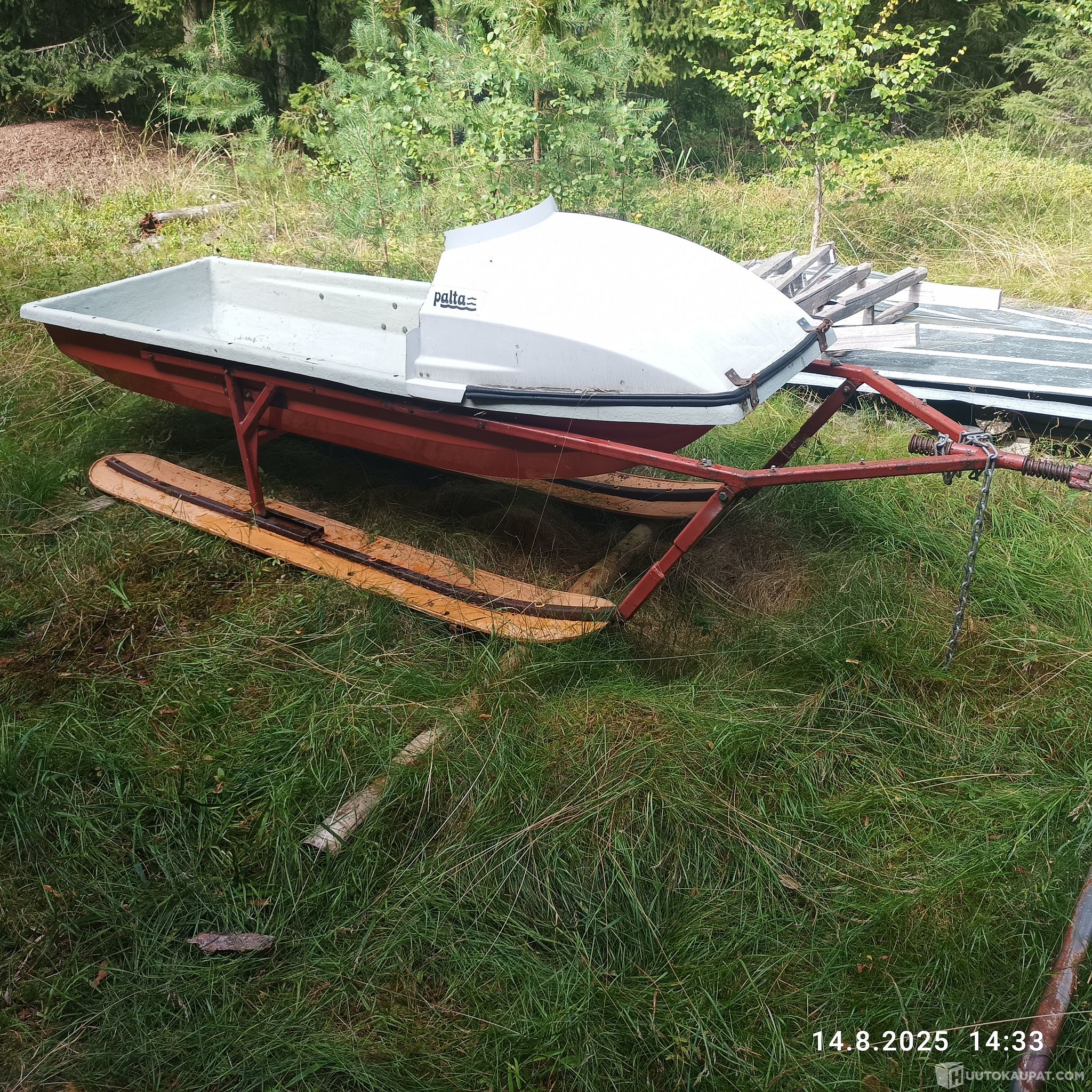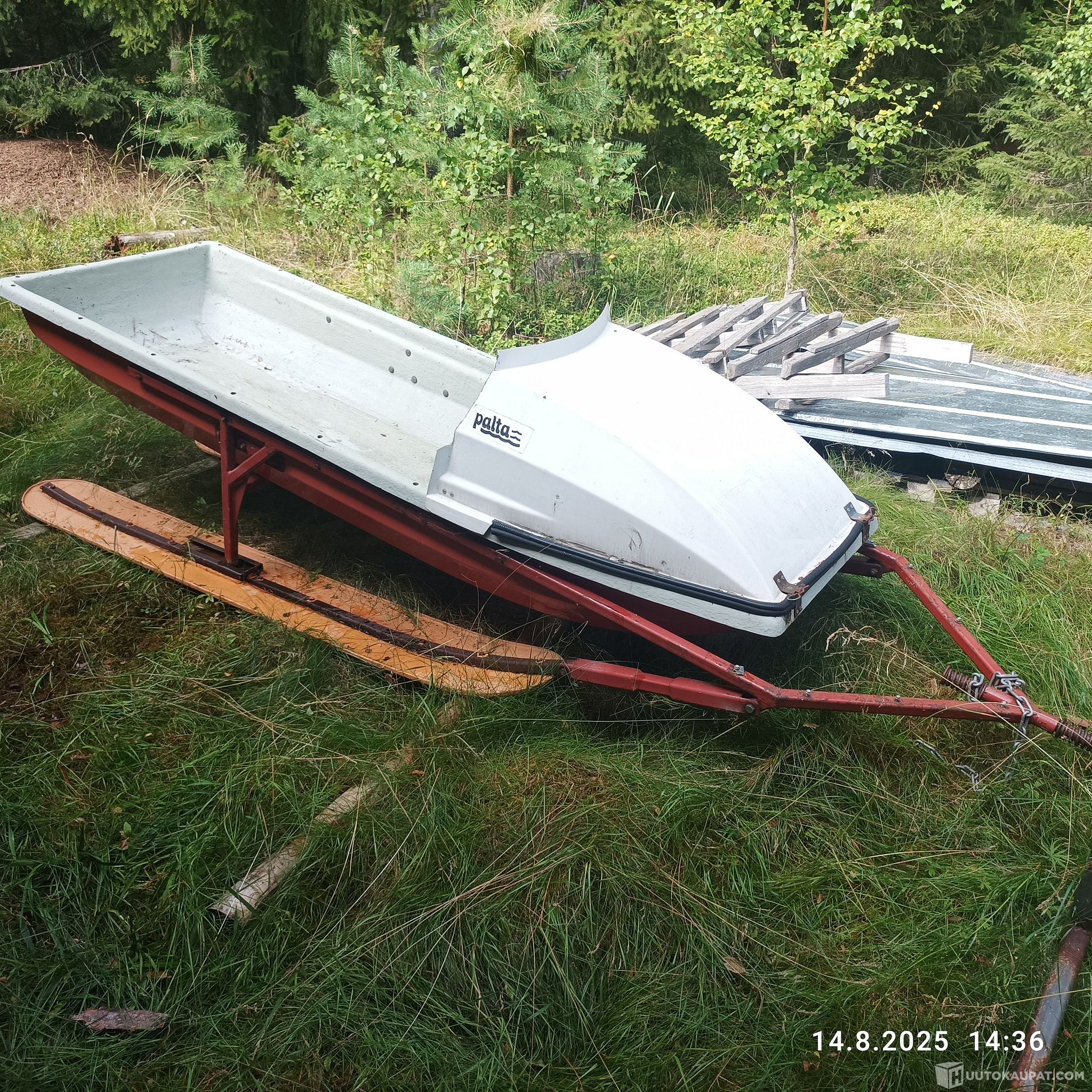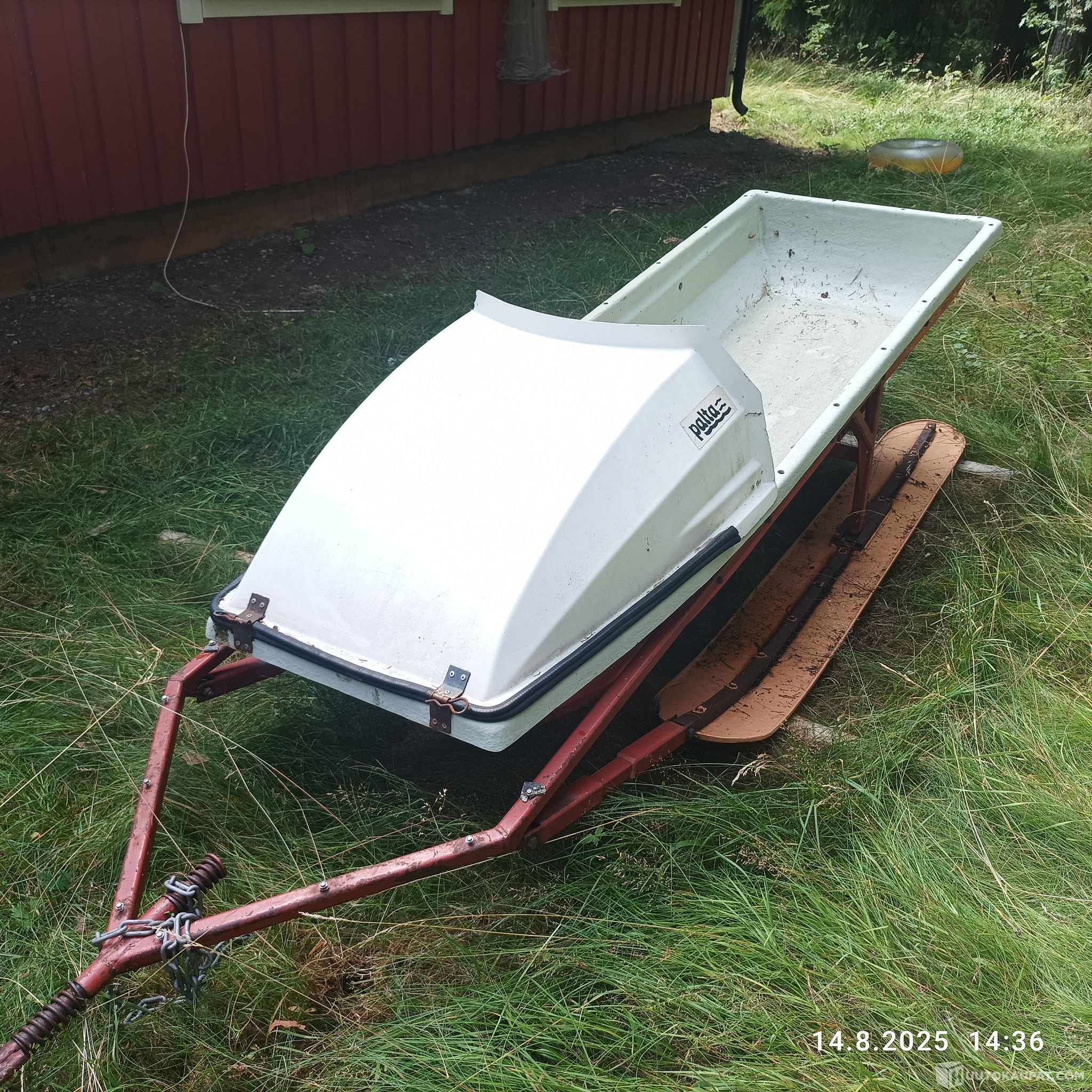 Harvinainen retroreki. Kokonaispituus 305 cm. Kaukalon pituus 240 cm ja leveys 80 cm. Irrotettava maski. Leveät ja tukevat jalakset. Voi vetää kelkalla, mönkijällä tai vaikka hevosella.