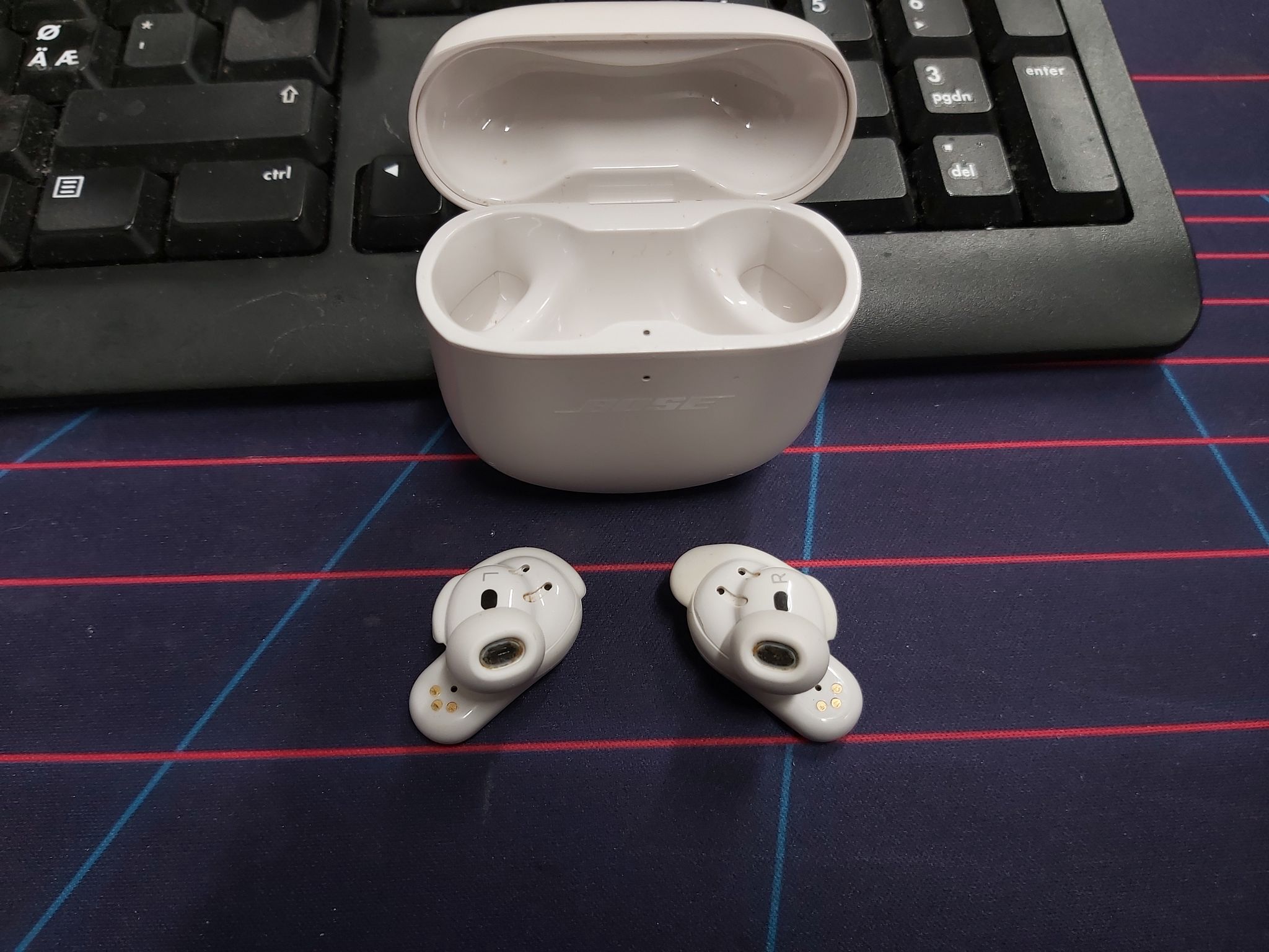Käytetyt. Mukana napit, latauskotelo ja laturi. Korvapehmusteet kokoa M