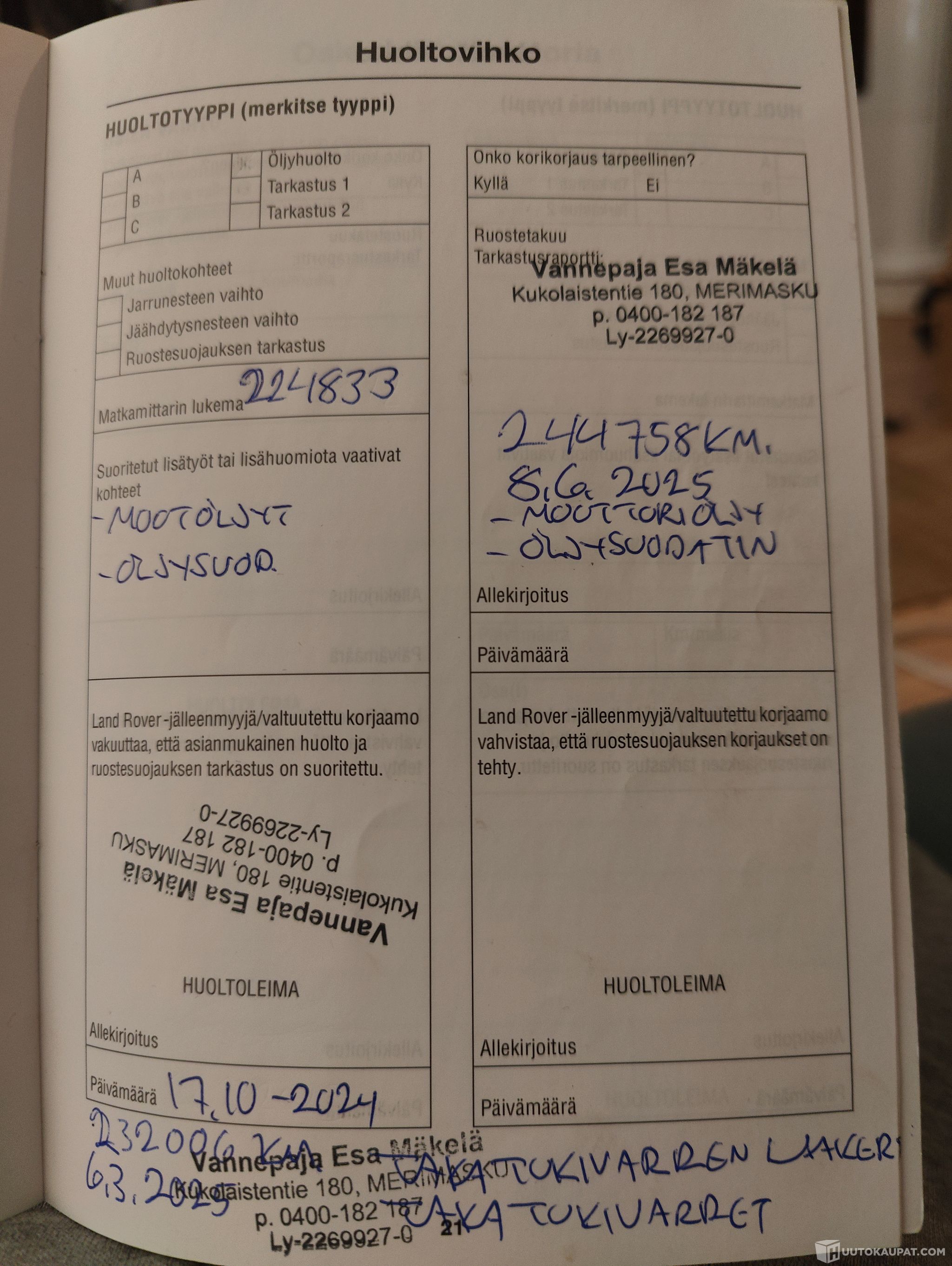 Ainoa vika ilma-alustan johtosarjavika. Ei vaikuta käyttöön, alusta toimii normaalisti. Ilma-alustan vikavalo syttyy silloin tällöin. Vian selvitys tehty Land Rovereihin erikoistuneessa Jag-Finn Oy -korjaamolla Espoossa. Vian korjaus ajaksi varattava max. 4h (~100€/h). Tästä dokumentti mukaan, tiedot löytyvät myös liikkeestä rekisterinumerolla.
