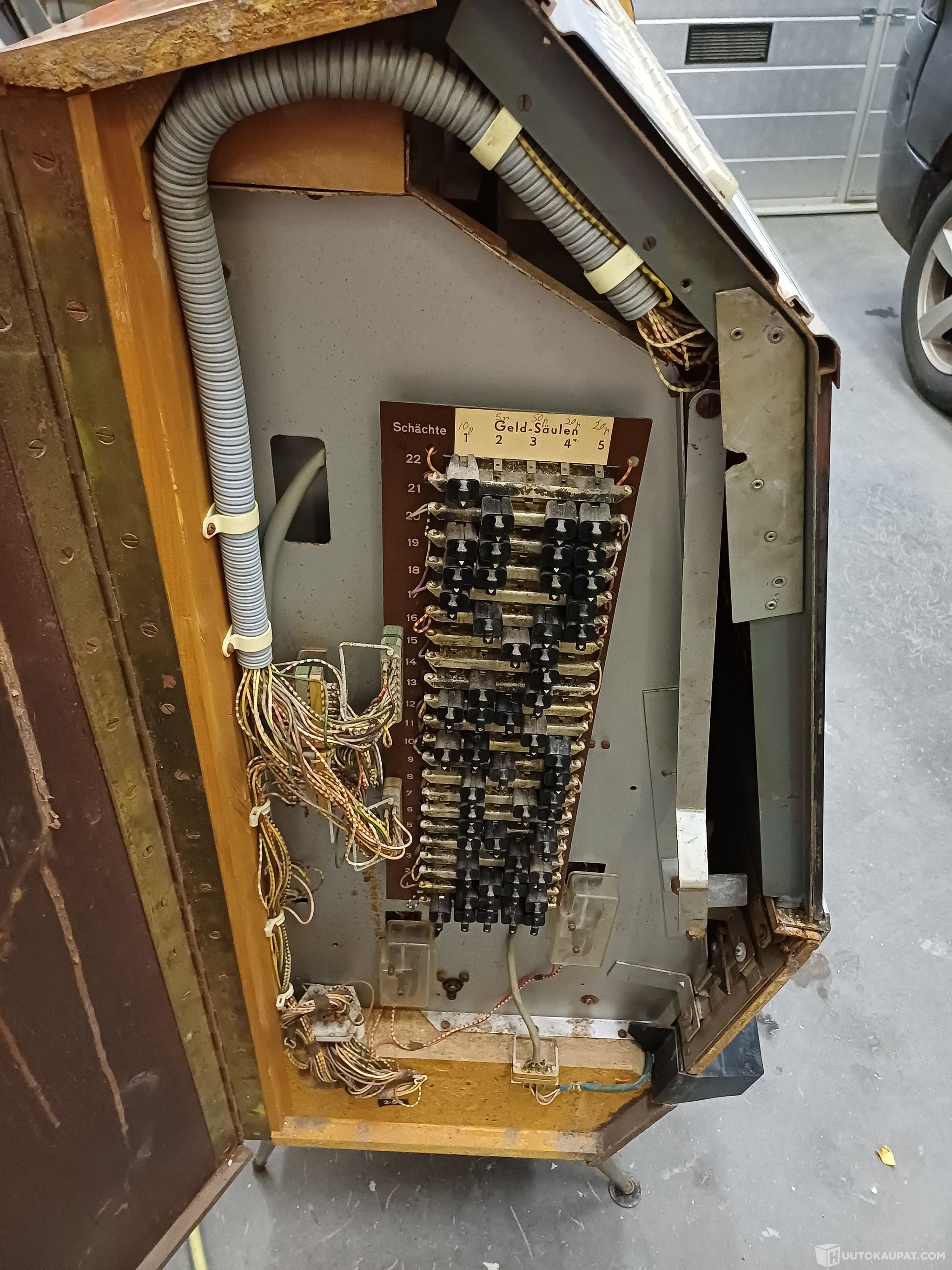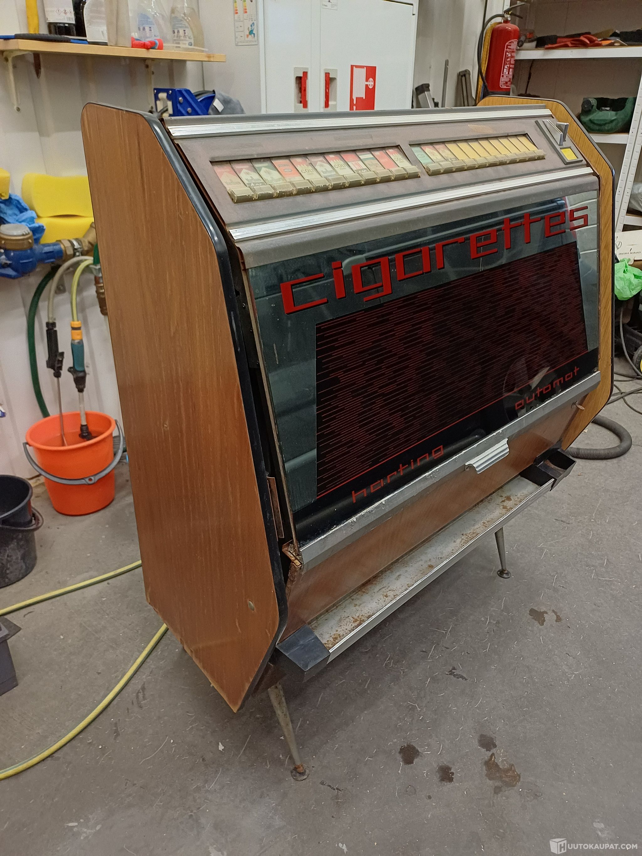 Nyt olisi hyvä projekti tehdä vaikka baarikaappi man caveen! Ollut kylmässä tilassa monta vuotta, joten tuskin lähtee tulille. Rahalukko puuttuu. Huom. Jos luulit että sisällä on norttia seuraavaksi vuodeksi niin tuotan sinulle pettymyksen. Ne ovat kaikki tyhjijä toppia!